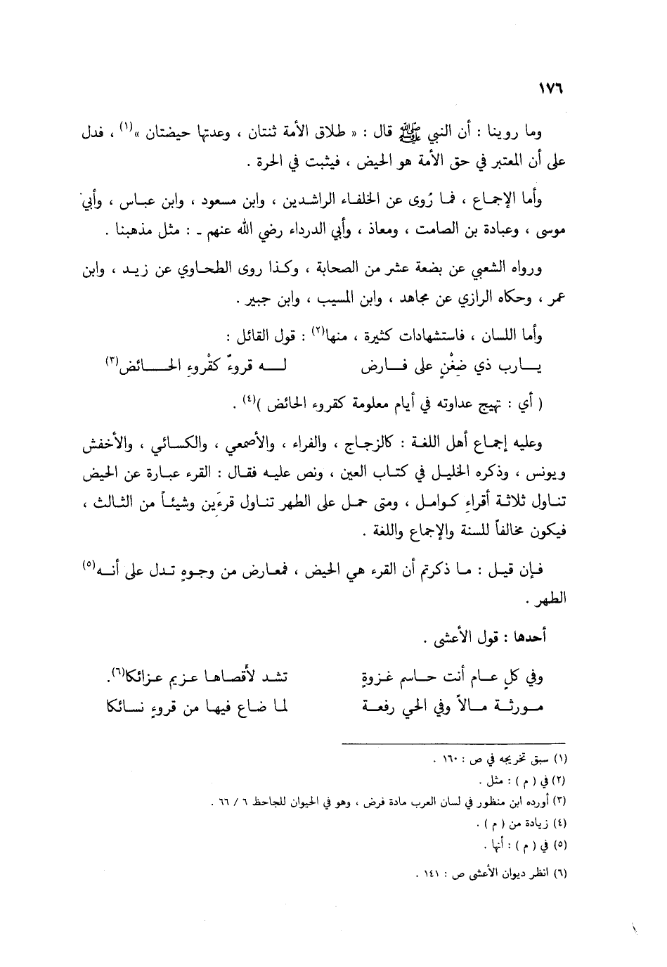 وَعَلِيهِ أجماع أهل اللُّغَة كالزجاج وَالْفراء والأصمعي وَالْكسَائِيّ والأخفش وَيُونُس وَذكره الْخَلِيل فِي كتاب الْعين وَنَصّ عَلَيْهِ فَقَالَ الْقُرْء عبارَة عَن الْحيض تنَاول ثَلَاثَة أَقراء كوامل وَمَتى حمل على الطُّهْر تنَاول قرءين وشيئا من الثَّالِث فَيكون مُخَالفا للسّنة وَالْإِجْمَاع واللغة فَإِن قيل مَا ذكرْتُمْ أَن الْقُرْء هِيَ الْحيض فمعارض من وُجُوه تدل على أَنه الطُّهْر أَحدهَا قَول الْأَعْشَى