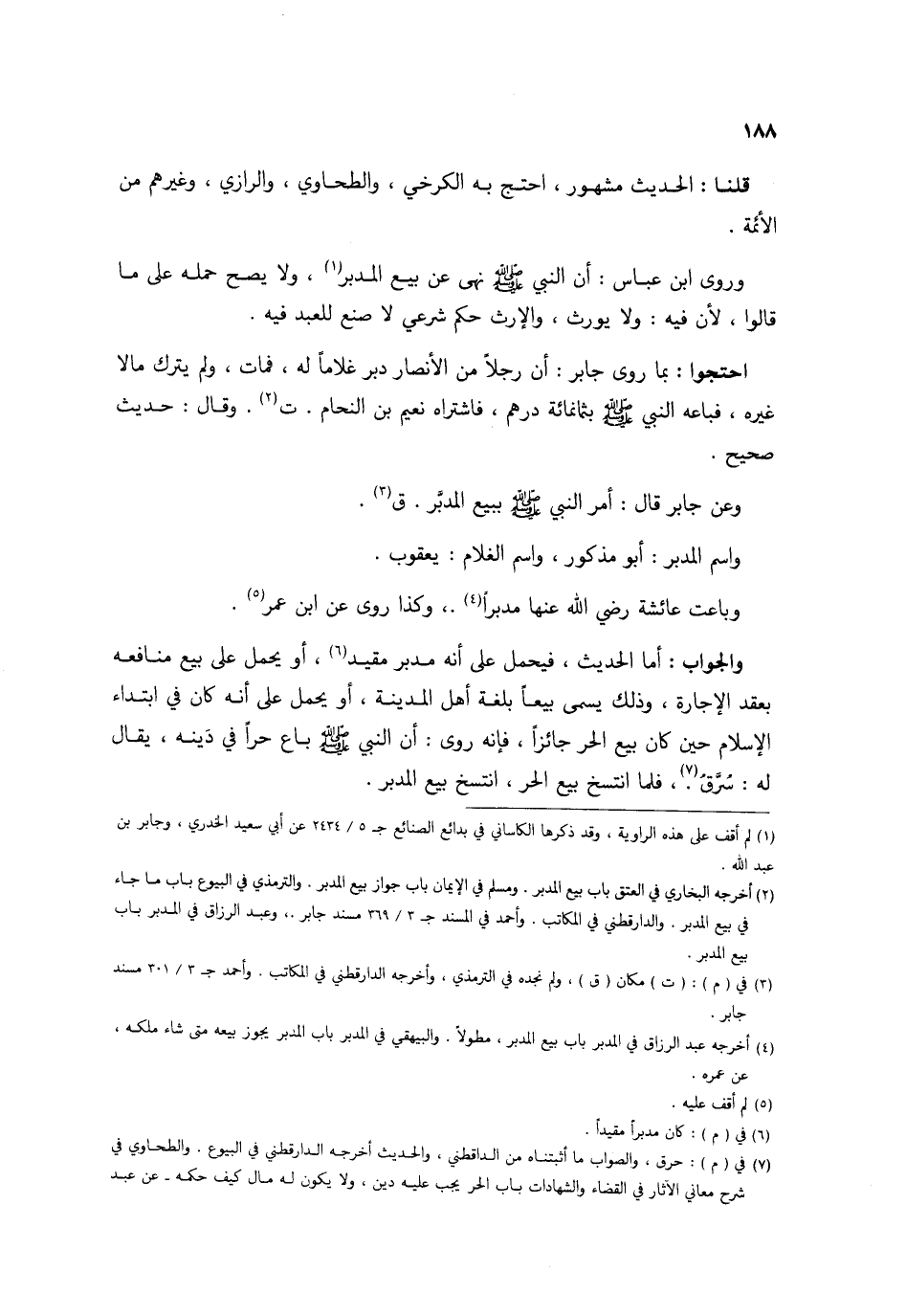 احْتَجُّوا بِمَا روى جَابر أَن رجلا من الْأَنْصَار دبر غُلَاما لَهُ فَمَاتَ وَلم يتْرك مَالا غَيره فَبَاعَهُ النَّبِي صلى الله عَلَيْهِ وَسلم بثمانمائة دِرْهَم فَاشْتَرَاهُ نعيم بن النحام ت وَقَالَ حَدِيث صَحِيح وَعَن جَابر قَالَ أَمر النَّبِي صلى الله عَلَيْهِ وَسلم بِبيع الْمُدبر ق وَاسم الْمُدبر أَبُو مَذْكُور وَاسم الْغُلَام يَعْقُوب وباعت عَائِشَة رَضِي الله عَنْهَا مُدبرا وَكَذَا رُوِيَ عَن ابْن عمر