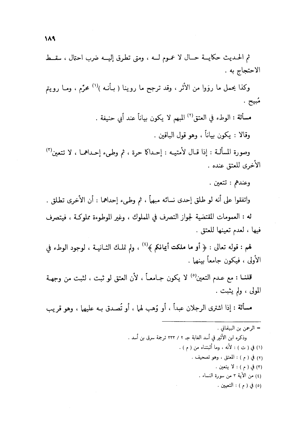 ثمَّ الحَدِيث حِكَايَة حَال لَا عُمُوم لَهُ وَمَتى تطرق إِلَيْهِ ضرب احْتِمَال سقط الِاحْتِجَاج بِهِ وَكَذَا يحمل مَا رووا من الْأَثر وَقد ترجح مَا روينَا بِأَنَّهُ محرم وَمَا رويتم مُبِيح مَسْأَلَة الْوَطْء فِي الْعتْق الْمُبْهم لَا يكون بَيَانا عِنْد أبي حنيفَة وَقَالا يكون بَيَانا وَهُوَ قَول البَاقِينَ وَصُورَة الْمَسْأَلَة إِذا قَالَ لأمتيه إِحْدَاكُمَا حرَّة ثمَّ وطىء أحداهم لَا تتَعَيَّن الآخرى لِلْعِتْقِ عِنْده وَعِنْدهم تتَعَيَّن وَاتَّفَقُوا على أَنه لَو طلق إِحْدَى نِسَائِهِ مُبْهما ثمَّ وطىء إداهما أَن ألأخرى تطلق لَهُ العمومات الْمُقْتَضِيَة لجَوَاز التَّصَرُّف فِي الْمَمْلُوك وَغير الْمَوْطُوءَة مَمْلُوكَة فيتصرف ليها لعدم تعينها لِلْعِتْقِ لَهُم قَوْله تَعَالَى {أَو مَا ملكت أَيْمَانكُم} وَلم تملك الثَّانِيَة لوُجُود الْوَطْء فِي الآولى فَيكون جَامعا بَينهمَا قُلْنَا مَعَ عدم التعين لَا يكون جَامعا لِأَن الْعتْق لَو ثَبت لثبت من وجهة الْمولى وَلم يثبت مَسْأَلَة إِذا اشْترى الرّجلَانِ عبدا أَو وهب لَهما أَو تصدق بِهِ عَلَيْهِمَا وَهُوَ قريب