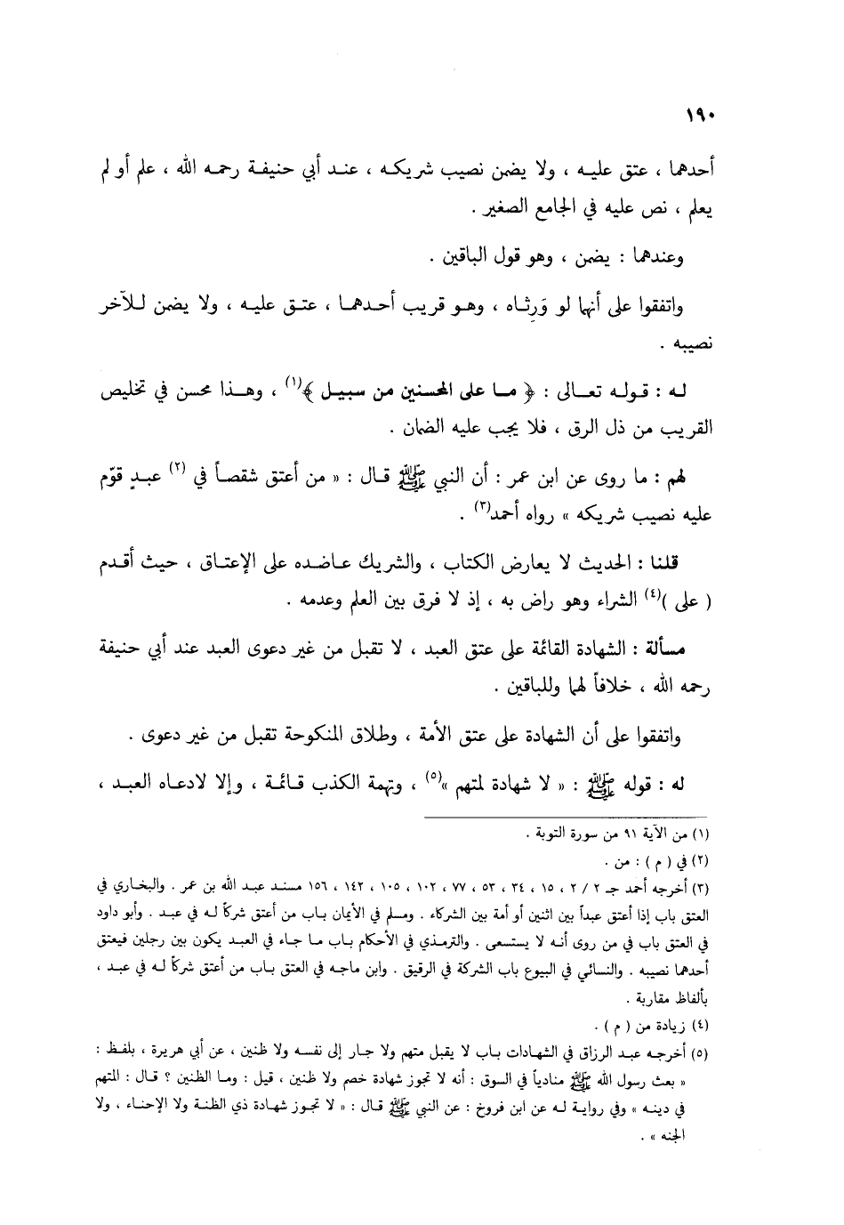 لَهُم مَا رُوِيَ عَن ابْن عمر أَن النَّبِي صلى الله عَلَيْهِ وَسلم قَالَ من أعتق شِقْصا فِي عبد قوم عَلَيْهِ نصيب شَرِيكه رَوَاهُ أَحْمد