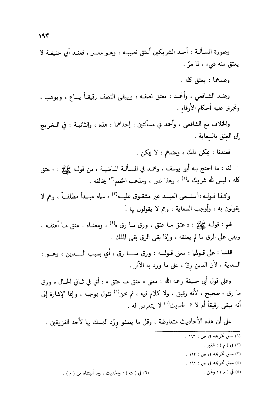 وعَلى قَول أبي حنيفَة رَحمَه الله معنى عتق مَا عتق أَي فِي ثَانِي الْحَال ورق مَا رق صَحِيح لِأَنَّهُ رَقِيق وَلَا كَلَام فِيهِ ثمَّ نَحن نقُول بِمُوجبِه وَإِنَّمَا الأشارة إِلَى أَنه يبْقى رَقِيقا أم لَا الحَدِيث لَا يتَعَرَّض لَهُ على أَن هَذِه الْأَحَادِيث متعارضة وَقل مَا يصفو ورد التَّمَسُّك بهَا لأحد الْفَرِيقَيْنِ