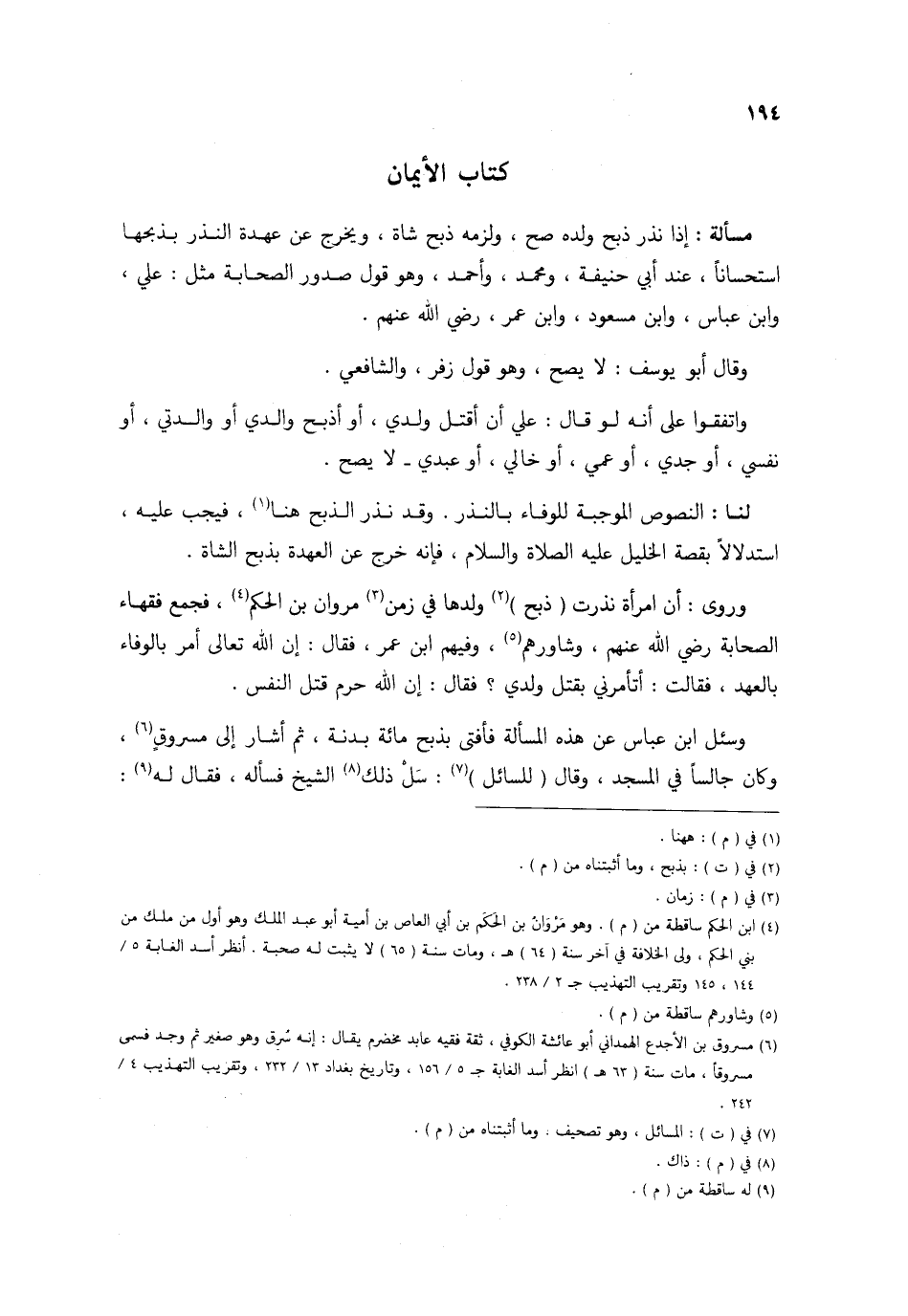 وَرُوِيَ أَن امْرَأَة نذرت ذبح وَلَدهَا فِي زمن مَرْوَان بن الحكم فَجمع فُقَهَاء الصَّحَابَة رَضِي الله عَنْهُم وشاورهم وَفِيهِمْ ابْن عمر فَقَالَ إِن الله تَعَالَى أَمر بِالْوَفَاءِ بالعهد فَقَالَت أتأمرني بقت وَلَدي فَقَالَ إِن الله حرم قتل النَّفس