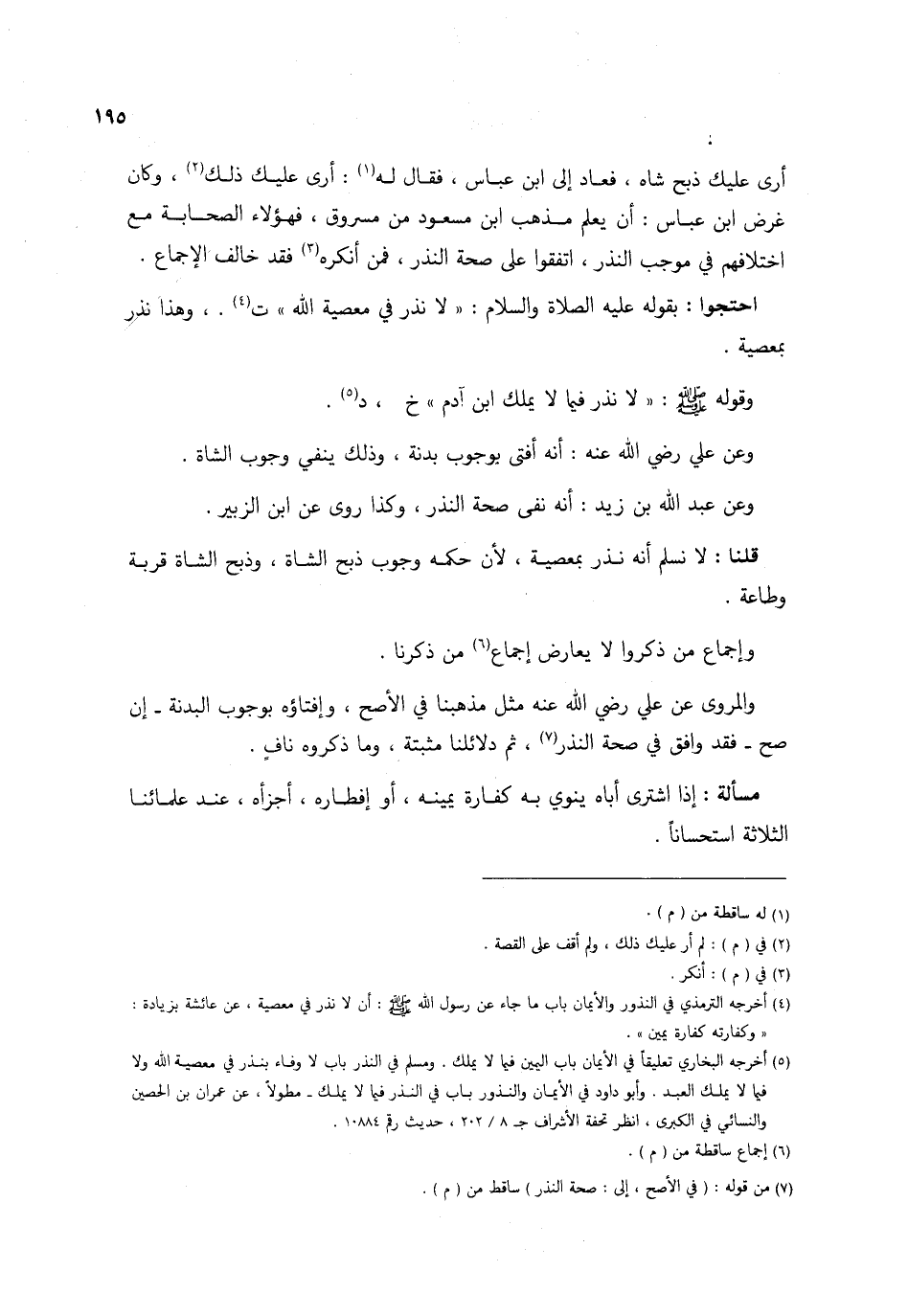 أرى عَلَيْك ذبح شاه فَعَاد إِلَى ابْن عَبَّاس فَقَالَ لَهُ أرى عَلَيْك ذَلِك وَكَانَ غَرَض ابْن عَبَّاس أَن يعلم مَذْهَب ابْن مَسْعُود من مَسْرُوق فَهَؤُلَاءِ الصَّحَابَة مَعَ اخْتلَافهمْ فِي مُوجب النّذر اتَّفقُوا على صِحَة النّذر فَمن أنكرهُ فقد خَالف الْإِجْمَاع احْتَجُّوا بقوله عَلَيْهِ الصَّلَاة وَالسَّلَام لَا نذر فِي مَعْصِيّة الله ت وَهَذَا نذر بِمَعْصِيَة وَقَوله صلى الله عَلَيْهِ وَسلم لَا نذر فِيمَا لَا يملك ابْن آدم خَ د وَعَن عَليّ رَضِي الله عَنهُ أَنه أفتى بِوُجُوب بَدَنَة وَذَلِكَ يَنْفِي وجوب الشَّاة وَعَن عبد الله بن زيد أَنه نفى صِحَة النّذر وَكَذَا روى عَن ابْن الزبير قُلْنَا لَا نسلم أَنه نذر بِمَعْصِيَة لِأَن حكمه وجوب ذبح الشَّاة وَذبح الشَّاة قربَة وَطَاعَة وَإِجْمَاع من ذكرُوا لَا يُعَارض إِجْمَاع من ذكرنَا