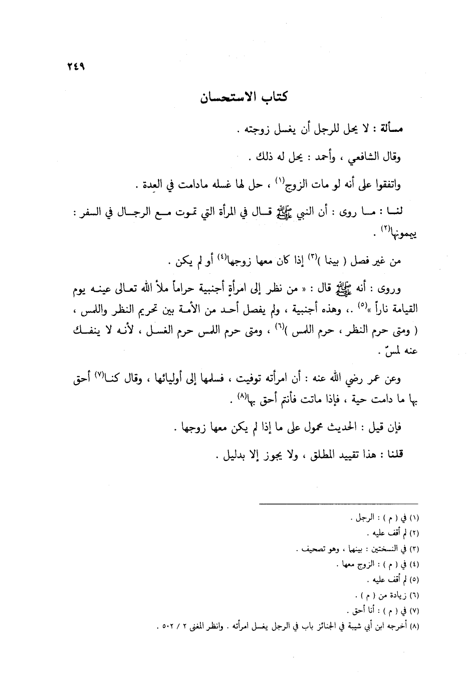 = كتاب الِاسْتِحْسَان = مَسْأَلَة لَا يحل للرجل أَن يغسل زَوجته وَقَالَ الشَّافِعِي وَاحْمَدْ يحل لَهُ ذَلِك وَاتَّفَقُوا على أَنه لَو مَاتَ الزَّوْج حل لَهَا غسله مَا دَامَت فِي الْعدة لنا مَا روى أَن النَّبِي صلى الله عَلَيْهِ وَسلم قَالَ فِي الْمَرْأَة الَّتِي تَمُوت مَعَ الرِّجَال فِي السّفر ييممونها من غير فصل (بَيْنَمَا) إِذا كَانَ مَعهَا زَوجهَا أَو لم يكن