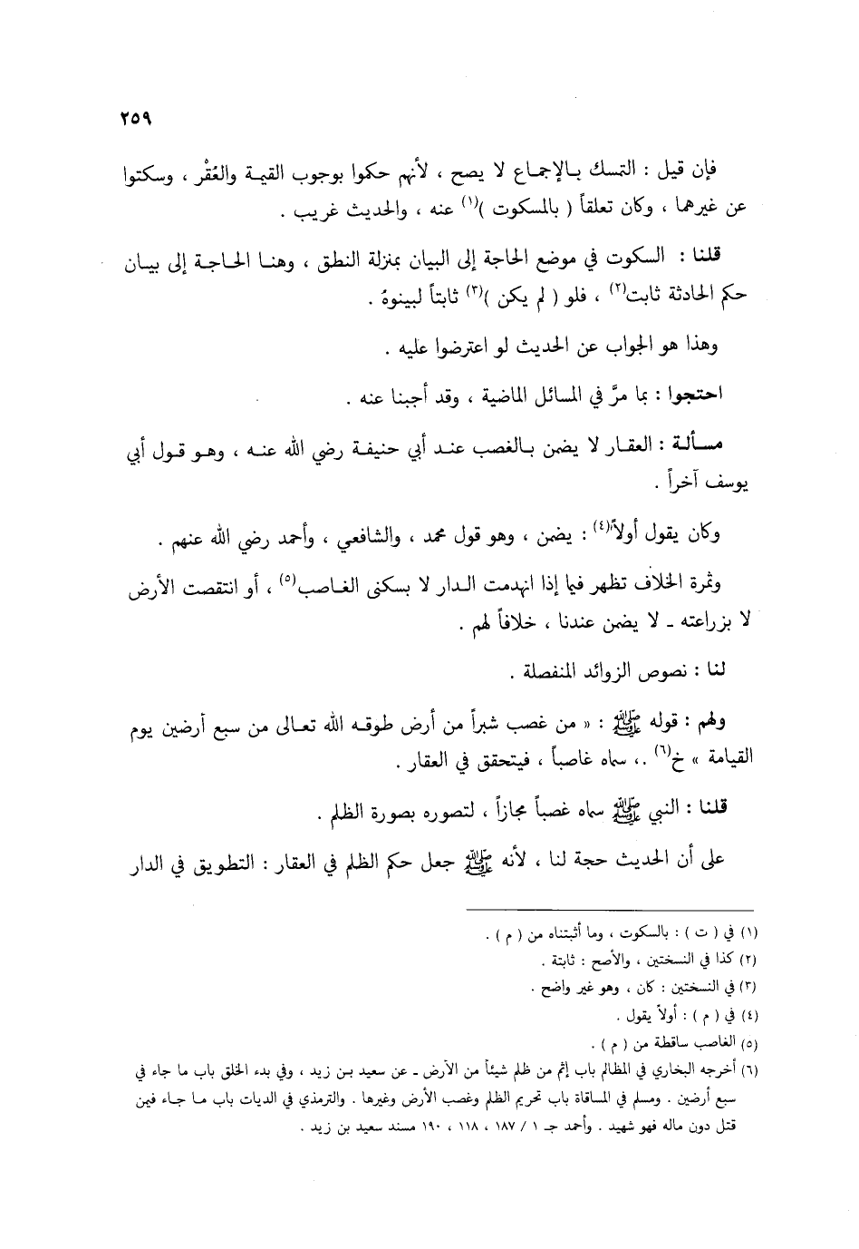 قُلْنَا السُّكُوت فِي مَوضِع الْحَاجة إِلَى الْبَيَان بِمَنْزِلَة النُّطْق وَهنا الْحَاجة إِلَى بَيَان حكم الْحَادِثَة ثَابت فَلَو لم يكن ثَابتا لبينوه وَهَذَا هُوَ الْجَواب عَن الحَدِيث لَو اعْترضُوا عَلَيْهِ احْتَجُّوا بِمَا مر فِي الْمسَائِل الْمَاضِيَة وَقد أجبنا عَنهُ مَسْأَلَة الْعقار لَا يضمن بِالْغَصْبِ عِنْد أبي حنيفَة رَضِي الله عَنهُ وَهُوَ قَول أبي يُوسُف آخرا وَكَانَ يَقُول أَولا يضمن وَهُوَ قَول مُحَمَّد وَالشَّافِعِيّ وَاحْمَدْ رَضِي الله عَنْهُم