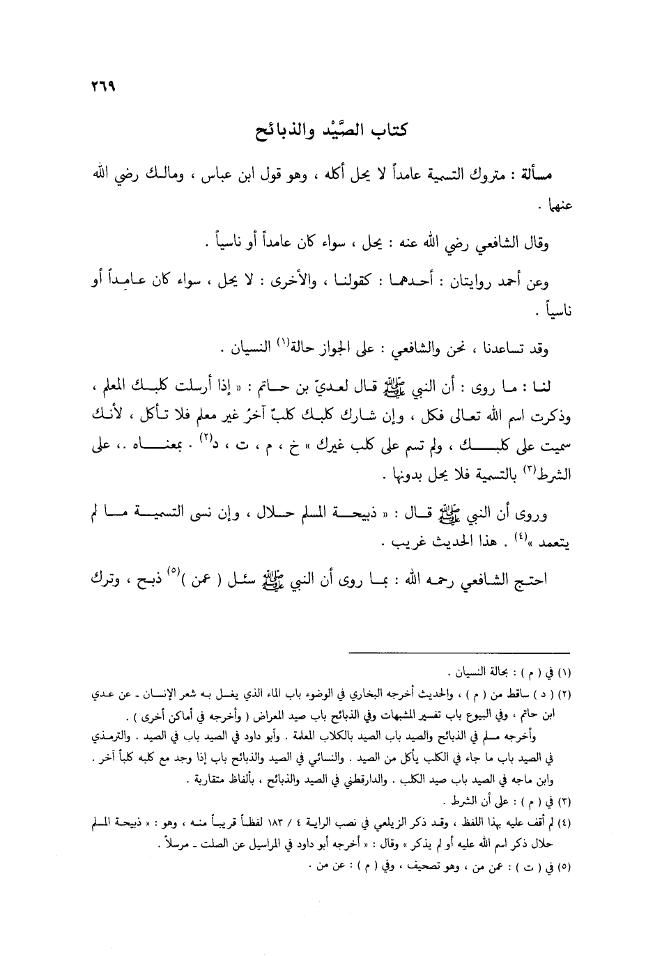 مَسْأَلَة مَتْرُوك التَّسْمِيَة عَامِدًا لَا يحل أكله وَهُوَ قَول ابْن عَبَّاس وَمَالك رَضِي الله عَنْهُمَا وَقَالَ الشَّافِعِي رَضِي الله عَنهُ يحل سَوَاء كَانَ عَامِدًا أَو نَاسِيا وَعَن أَحْمد رِوَايَتَانِ أَحدهمَا كَقَوْلِنَا وَالْأُخْرَى لَا يحل سَوَاء كَانَ عَامِدًا أَو نَاسِيا وَقد تساعدنا نَحن وَالشَّافِعِيّ على الْجَوَاز حَالَة النسْيَان