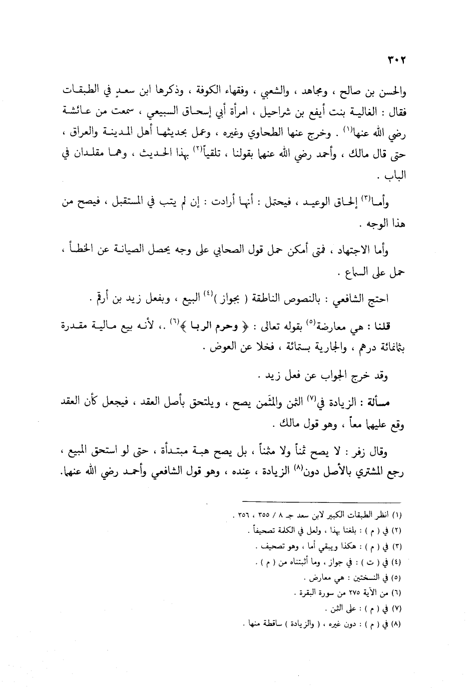 وَالْحسن بن صَالح وَمُجاهد وَالشعْبِيّ وفقهاء الْكُوفَة وَذكرهَا ابْن سعد فِي الطَّبَقَات فَقَالَ الغالية بنت أَيفع بن شرَاحِيل امْرَأَة أبي إِسْحَاق السبيعِي سَمِعت من عَائِشَة رَضِي الله عَنْهَا وَخرج عَنْهَا الطَّحَاوِيّ وَغَيره وَعمل بحديثها أهل الْمَدِينَة وَالْعراق حَتَّى قَالَ مَالك وَاحْمَدْ رَضِي الله عَنْهُمَا بقولنَا تلقيا بِهَذَا الحَدِيث وهما مقلدان فِي الْبَاب وَأما إِلْحَاق الْوَعيد فَيحْتَمل أَنَّهَا أَرَادَت إِن لم يتب فِي الْمُسْتَقْبل فَيصح من هَذَا الْوَجْه وَأما الِاجْتِهَاد فَمَتَى أمكن حمل قَول الصَّحَابِيّ على وَجه يحصل الصيانة عَن الْخَطَأ حمل على السماع احْتج الشَّافِعِي بالنصوص الناطقة بِجَوَاز البيع وبفعل زيد بن أَرقم