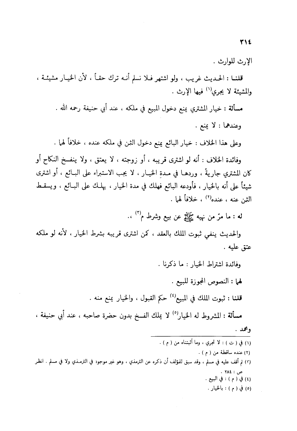 قُلْنَا الحَدِيث غَرِيب وَلَو اشْتهر فَلَا نسلم أَنه ترك حَقًا لِأَن الْخِيَار مَشِيئَة والمشيئة لَا يجْرِي فِيهَا الْإِرْث مَسْأَلَة خِيَار المُشْتَرِي يمْنَع دُخُول الْمَبِيع فِي ملكه عِنْد أبي حنيفَة رَحمَه الله وَعِنْدَهُمَا لَا يمْنَع وعَلى هَذَا الْخلاف خِيَار البَائِع يمْنَع دُخُول الثّمن فِي ملكه عِنْده خلافًا لَهما