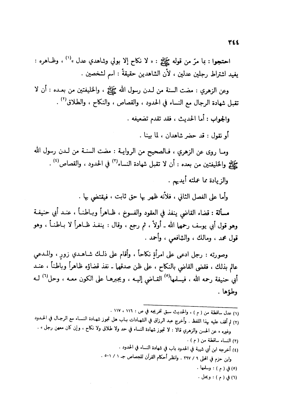 وَعَن الزُّهْرِيّ مَضَت السّنة من لدن رَسُول الله صلى الله عَلَيْهِ وَسلم والخليفتين من بعده أَن لَا تقبل شَهَادَة الرِّجَال مَعَ النِّسَاء فِي الْحُدُود وَالْقصاص وَالنِّكَاح وَالطَّلَاق وَالْجَوَاب أما الحَدِيث فقد تقدم تَضْعِيفه أَو نقُول قد حضر شَاهِدَانِ لما بَينا