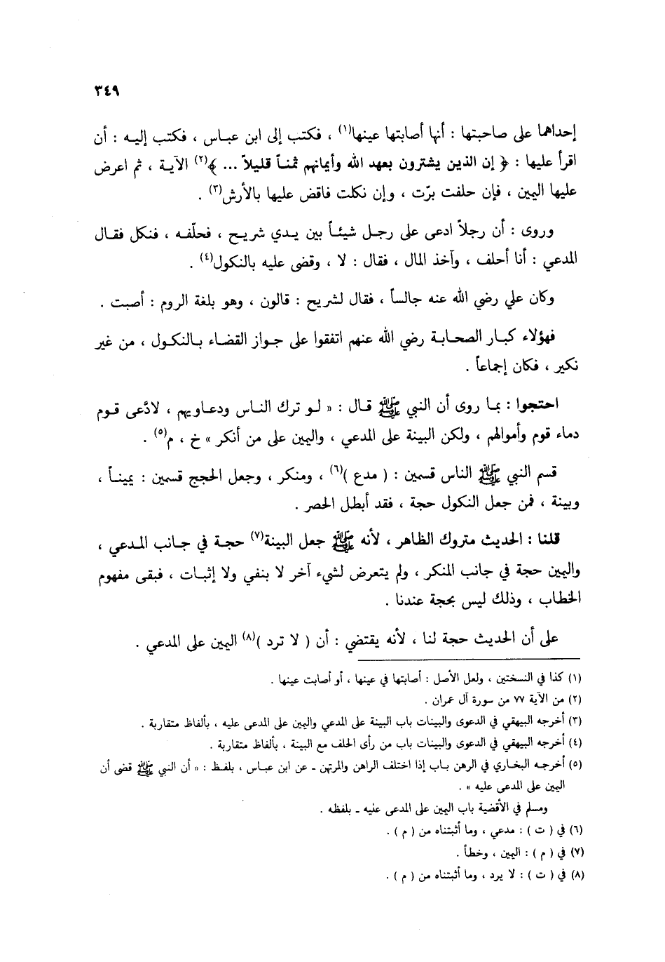 قسم النَّبِي صلى الله عَلَيْهِ وَسلم النَّاس قسمَيْنِ (مُدع) ومنكر وَجعل الْحجَج قسمَيْنِ يَمِينا وَبَيِّنَة فَمن جعل النّكُول حجَّة فقد أبطل الْحصْر