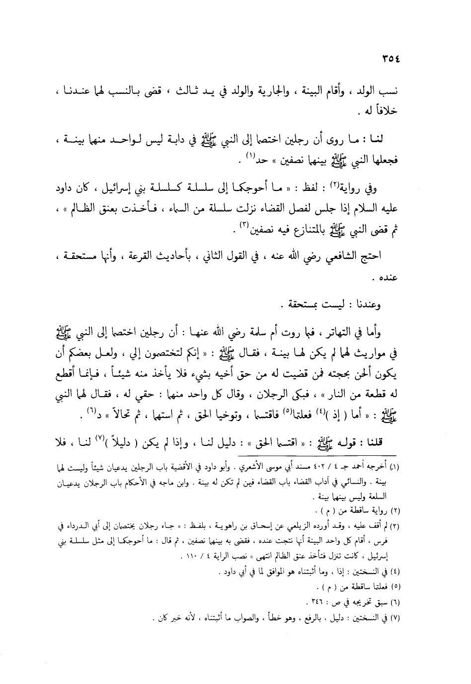 وَفِي رِوَايَة لفظ مَا أحوجكما إِلَى سلسلة كسلسلة بني إِسْرَائِيل كَانَ دَاوُد عَلَيْهِ السَّلَام إِذا جلس لفصل الْقَضَاء نزلت سلسلة من السَّمَاء فَأخذت بعنق الظَّالِم ثمَّ قضى النَّبِي صلى الله عَلَيْهِ وَسلم بالمتنازع فِيهِ نِصْفَيْنِ احْتج الشَّافِعِي رَضِي الله عَنهُ فِي القَوْل الثَّانِي بِأَحَادِيث الْقرعَة وَأَنَّهَا مُسْتَحقَّة عِنْده وَعِنْدنَا لَيست بمستحقة