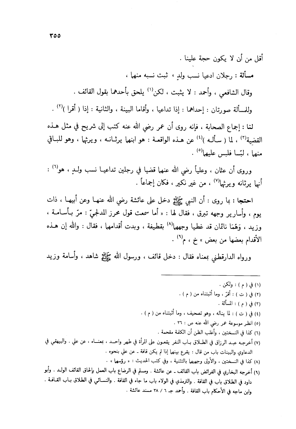أقل من أَن لَا يكون حجَّة علينا مَسْأَلَة رجلَانِ ادّعَيَا نسب ولد ثَبت نسبه مِنْهُمَا وَقَالَ الشَّافِعِي وَاحْمَدْ لَا يثبت لَكِن يلْحق بِأَحَدِهِمَا بقول الْقَائِف وللمسألة صُورَتَانِ إِحْدَاهمَا إِذا تداعيا وَأَقَامَا الْبَيِّنَة وَالثَّانيَِة إِذا (أقرا)