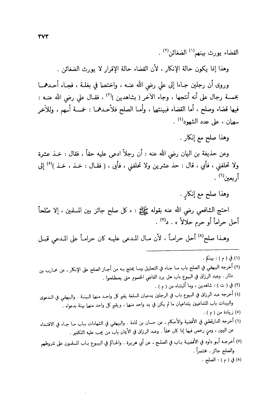 وروى أَن رجلَيْنِ جَاءَا إِلَى عَليّ رَضِي الله عَنهُ واختصما فِي بغلة فجَاء أَحدهمَا بِخَمْسَة رجال على أَنه أنتجها وَجَاء الآخر (بِشَاهِدين) فَقَالَ عَليّ رَضِي الله عَنهُ فِيهَا قَضَاء وَصلح أما الْقَضَاء فبينتهما وَأما الصُّلْح فلأحدهما خَمْسَة أسْهم وَللْآخر سَهْمَان على عدد الشُّهُود وَهَذَا صلح مَعَ إِنْكَار