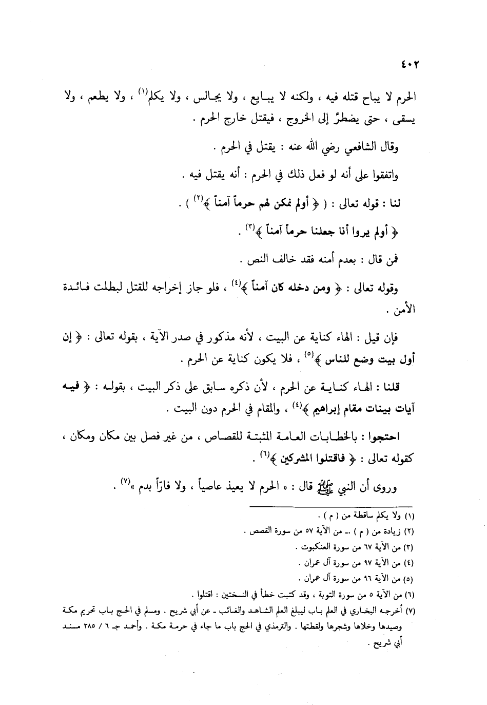الْحرم لَا يُبَاح قَتله فِيهِ وَلكنه لَا يُبَايع وَلَا يُجَالس وَلَا يكلم وَلَا يطعم وَلَا يسقى حَتَّى يضْطَر إِلَى الْخُرُوج فَيقْتل خَارج الْحرم وَقَالَ الشَّافِعِي رَضِي الله عَنهُ يقتل فِي الْحرم وَاتَّفَقُوا على أَنه لَو فعل ذَلِك فِي الْحرم أَنه يقتل فِيهِ لنا قَوْله تَعَالَى {أَو لم نمكن لَهُم حرما آمنا} {أَو لم يرَوا أَنا جعلنَا حرما آمنا} فَمن قَالَ بِعَدَمِ أمه فقد خَالف النَّص وَقَوله تَعَالَى {وَمن دخله كَانَ آمنا} فَلَو جَازَ إِخْرَاجه للْقَتْل لبطلت فَائِدَة الْأَمْن