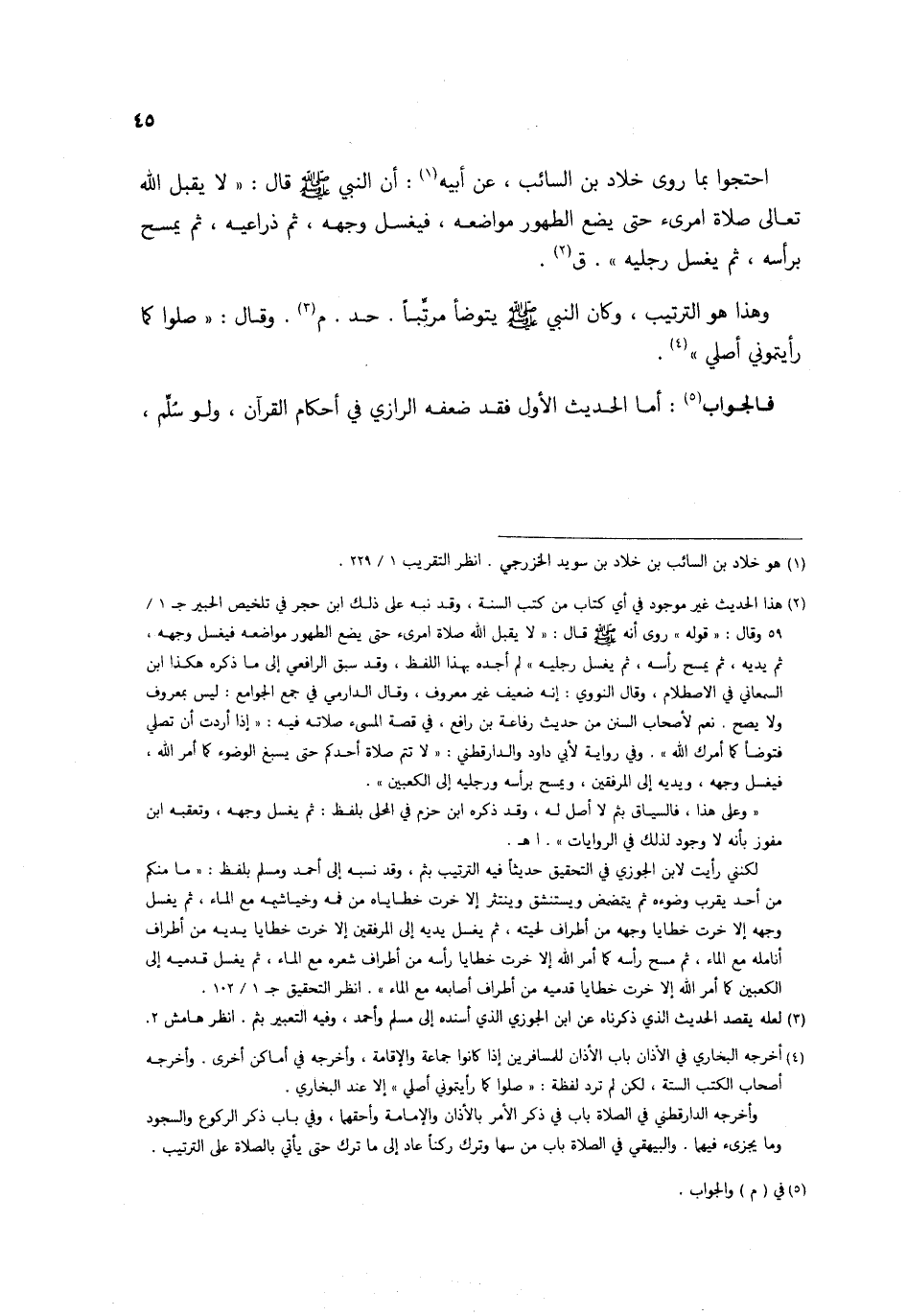 احْتَجُّوا بِمَا روى خَلاد بن السَّائِب عَن أيه أَن النَّبِي صلى الله عَلَيْهِ وَسلم قَالَ لَا يقبل الله تَعَالَى صَلَاة امرىء حَتَّى يضع الطّهُور موَاضعه فَيغسل وَجهه ثمَّ ذِرَاعَيْهِ ثمَّ يمسح بِرَأْسِهِ ثمَّ يغسل رجلَيْهِ ق