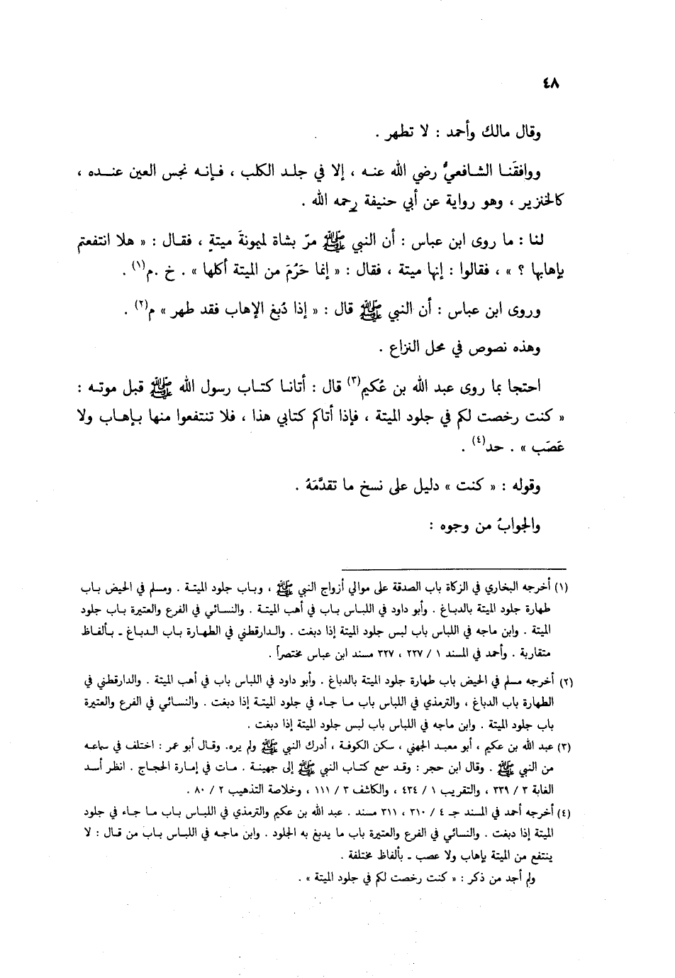 وروى ابْن عَبَّاس أَن النَّبِي صلى الله عَلَيْهِ وَسلم قَالَ إِذا دبغ الإهاب فقد طهر م وَهَذِه نُصُوص فِي مَحل النزاع