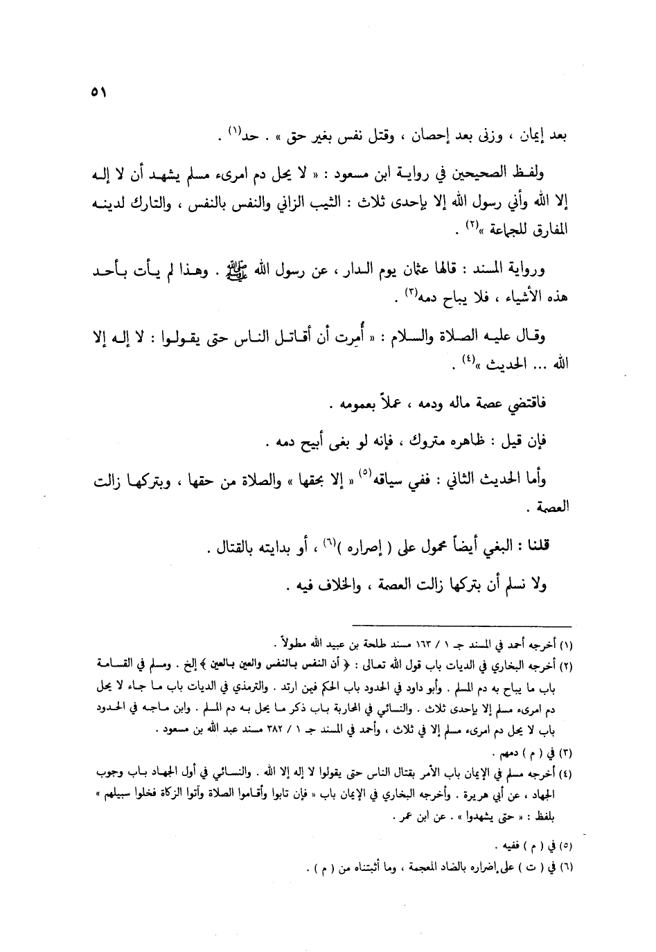 وَلَفظ الصَّحِيحَيْنِ فِي رِوَايَة ابْن مَسْعُود لَا يحل دم امرىء مُسلم يشْهد أَن لَا إِلَه إِلَّا الله وَأَنِّي رَسُول الله إِلَّا بِإِحْدَى ثَلَاث الثّيّب الزَّانِي وَالنَّفس بِالنَّفسِ والتارك لدينِهِ المفارق للْجَمَاعَة