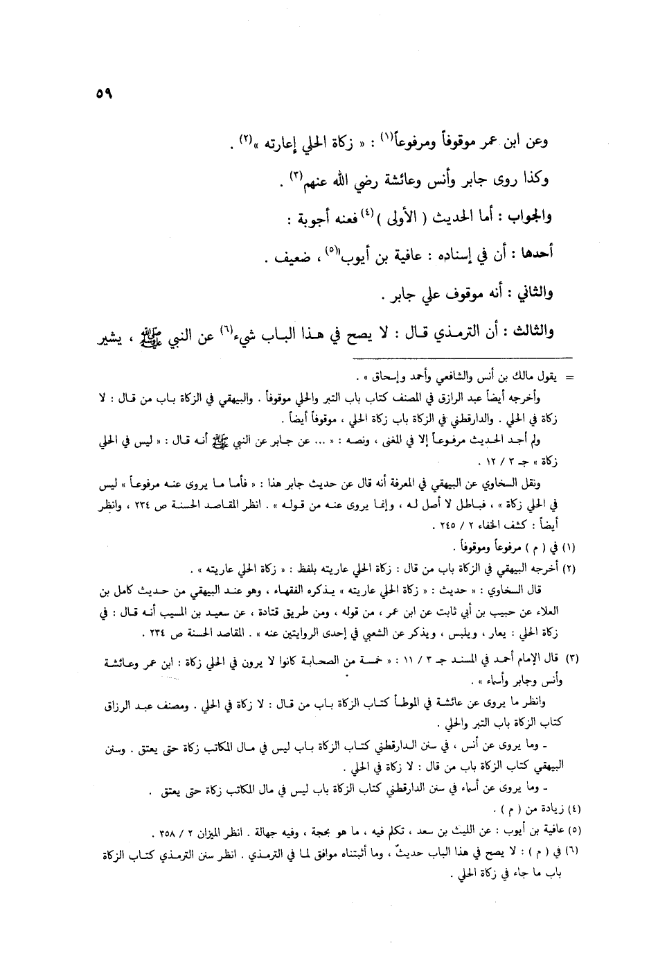 وَعَن ابْن عمر مَوْقُوفا وَمَرْفُوعًا زَكَاة الْحلِيّ إعارته وَكَذَا روى جَابر وَأنس وَعَائِشَة رَضِي الله عَنْهُم وَالْجَوَاب أما الحَدِيث الأول فَعَنْهُ أجوبة أَحدهَا إِن فِي إِسْنَاده عَافِيَة بن أَيُّوب ضَعِيف وَالثَّانِي أَنه مَوْقُوف عَليّ جَابر وَالثَّالِث أَن التِّرْمِذِيّ قَالَ لَا يَصح فِي هَذَا الْبَاب شَيْء عَن النَّبِي صلى الله عَلَيْهِ وَسلم يُشِير