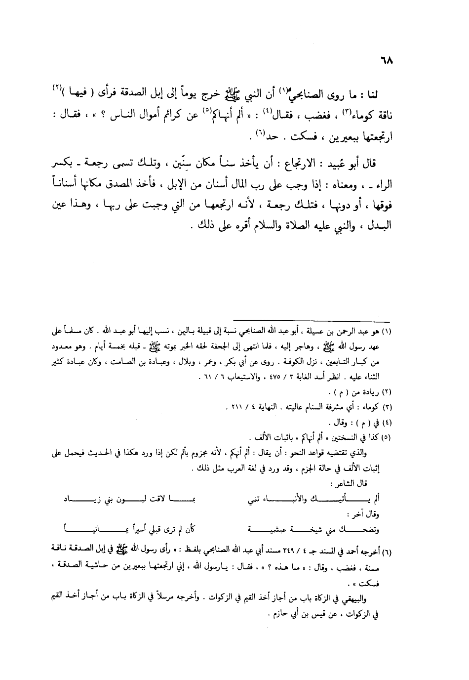 لنا مَا روى الصنَابحِي أَن النَّبِي صلى الله عَلَيْهِ وَسلم خرج يَوْمًا إِلَى إبل الصَّدَقَة فَرَأى فِيهَا نَاقَة كوماء فَغَضب فَقَالَ ألم أنهاكم عَن كرائم أَمْوَال النَّاس فَقَالَ ارتجعتها ببعيرين فَسكت حد