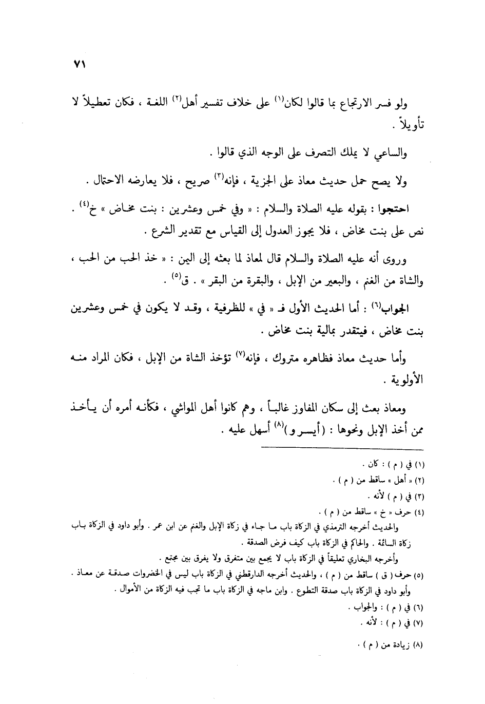 وَلَو فسر الارتجاع بِمَا قَالُوا لَكَانَ على خلاف تَفْسِير أهل اللُّغَة فَكَانَ تعطيلا لَا تَأْوِيلا والساعي لَا يملك التَّصَرُّف على الْوَجْه الَّذِي قَالُوا وَلَا يَصح حمل حَدِيث معَاذ على الْجِزْيَة فَإِنَّهُ صَرِيح فَلَا يُعَارضهُ الِاحْتِمَال