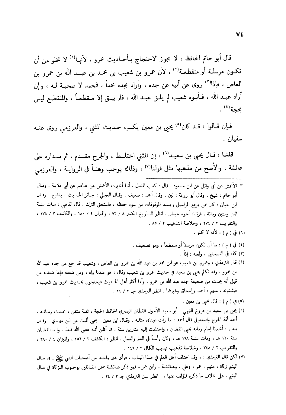 قَالَ أَبُو حَاتِم الْحَافِظ لَا يجوز الِاحْتِجَاج بِأَحَادِيث عَمْرو لِأَنَّهَا لَا تَخْلُو من أَن تكون مُرْسلَة أَو مُنْقَطِعَة لِأَن عَمْرو بن شُعَيْب بن مُحَمَّد بن عبد الله بن عَمْرو بن الْعَاصِ فَإِذا روى عَن أَبِيه عَن جده وَأَرَادَ بجده مُحَمَّدًا فمحمد لَا صُحْبَة لَهُ وَإِن أَرَادَ عبد الله فأبوه شُعَيْب لم يلق عبد الله فَلم يبْق إِلَّا مُنْقَطِعًا والمنقطع لَيْسَ بِحجَّة