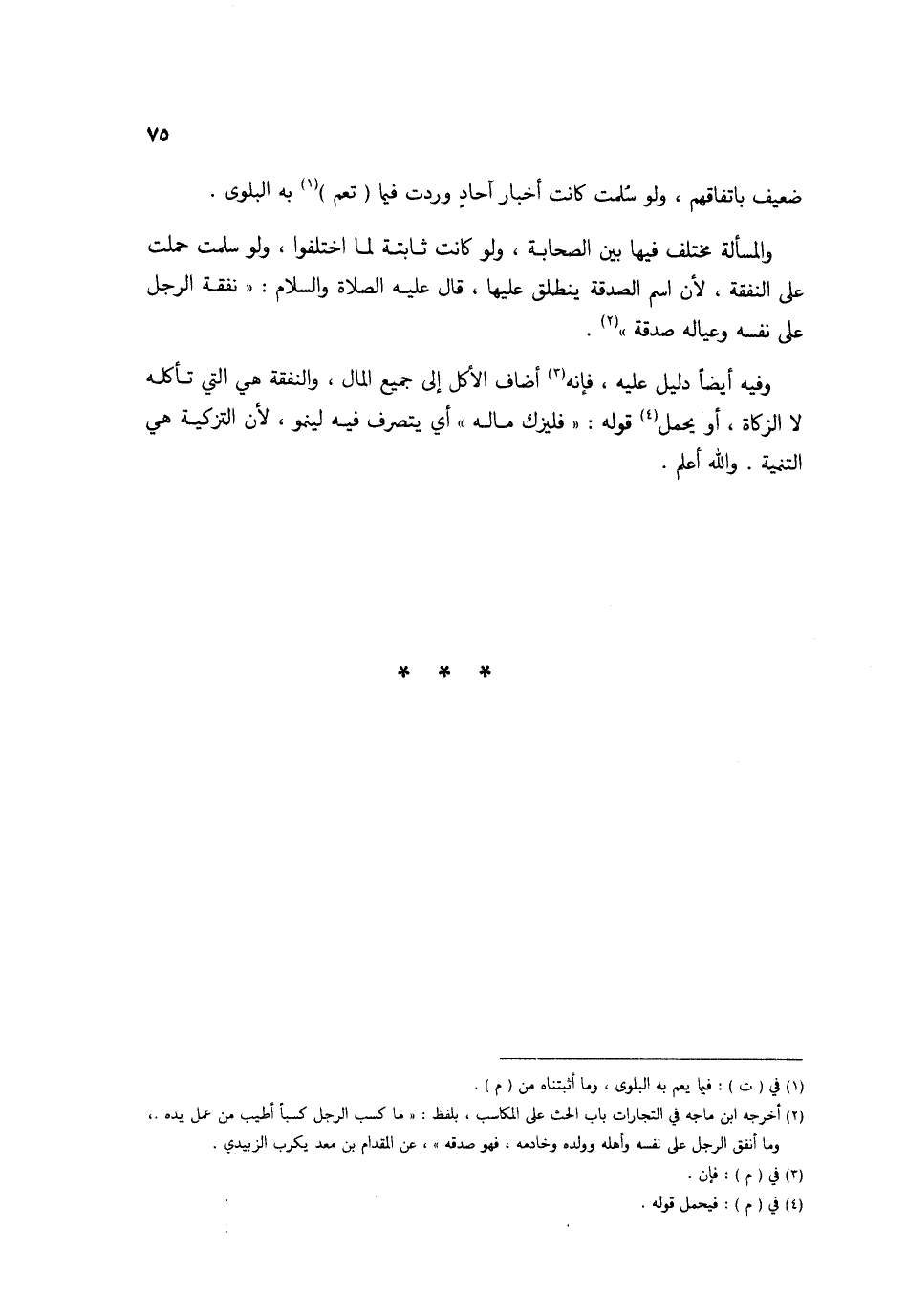 وَالْمَسْأَلَة مُخْتَلف فِيهَا بَين الصَّحَابَة وَلَو كَانَت ثَابِتَة لما اخْتلفُوا وَلَو سلمت حملت على النَّفَقَة لِأَن اسْم الصَّدَقَة ينْطَلق عَلَيْهَا قَالَ عَلَيْهِ الصَّلَاة وَالسَّلَام نَفَقَة الرجل على نَفسه وَعِيَاله صَدَقَة