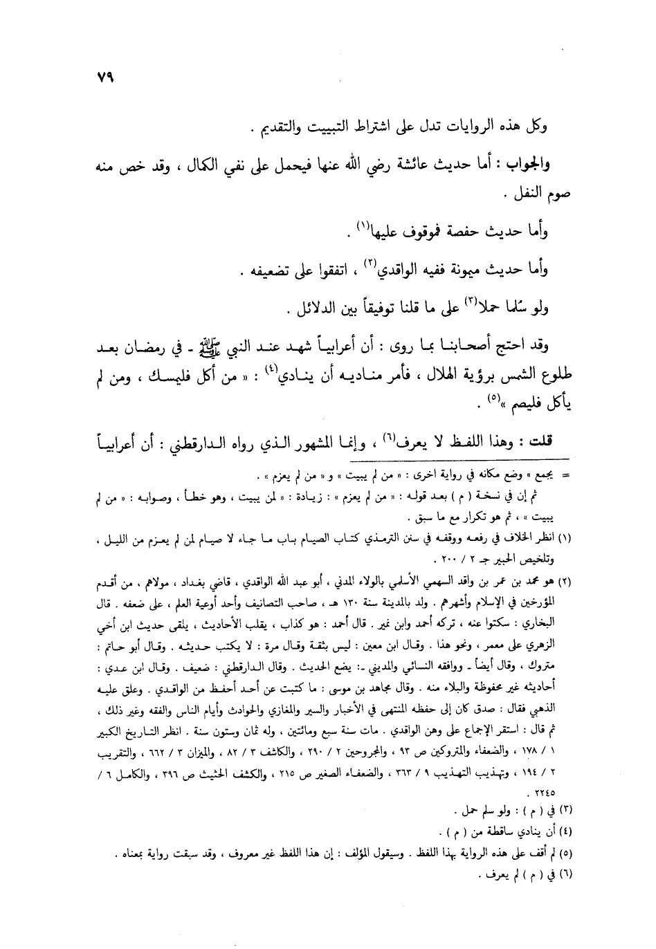 وكل هَذِه الرِّوَايَات تدل على اشْتِرَاط التبييت والتقديم وَالْجَوَاب أما حَدِيث عَائِشَة رَضِي الله عَنْهَا فَيحمل على نفي الْكَمَال وَقد خص مِنْهُ صَوْم النَّفْل وَأما حَدِيث حَفْصَة فموقوف عَلَيْهَا وَأما حَدِيث مَيْمُونَة فَفِيهِ الْوَاقِدِيّ اتَّفقُوا على تَضْعِيفه وَلَو سلما حملا على مَا قُلْنَا تَوْفِيقًا بَين الدَّلَائِل