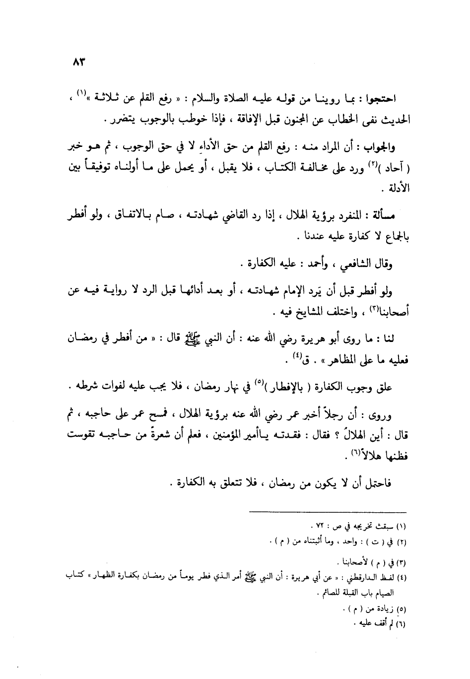 وَالْجَوَاب أَن المُرَاد مِنْهُ رفع الْقَلَم من حق الْأَدَاء لَا فِي حق الْوُجُوب ثمَّ هُوَ خبر (آحَاد) ورد على مُخَالفَة الْكتاب فَلَا يقبل أَو يحمل على مَا أولناه تَوْفِيقًا بَين الْأَدِلَّة