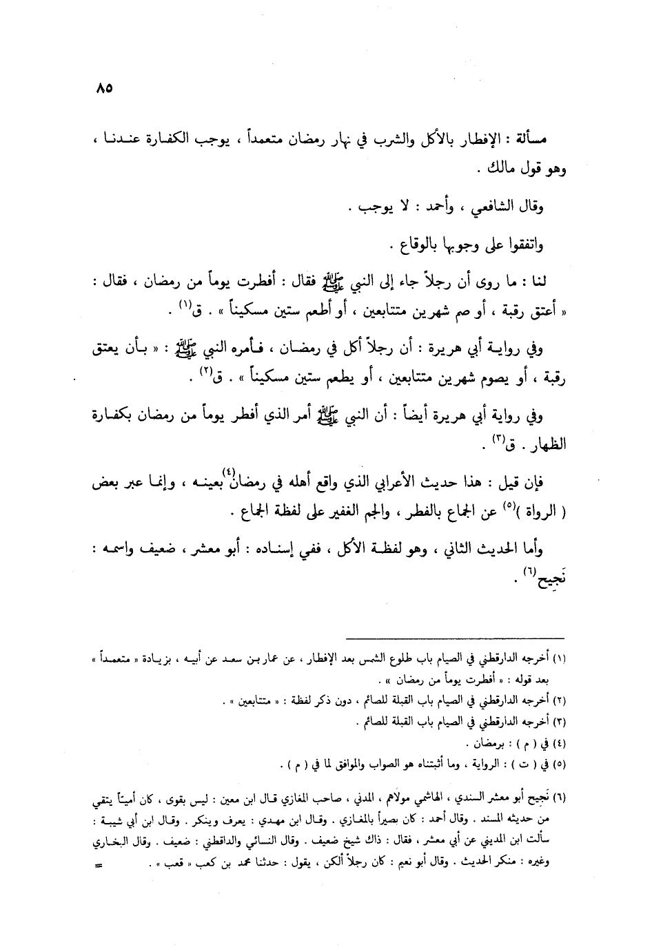 فَإِن قيل هَذَا حَدِيث الْأَعرَابِي الَّذِي وَاقع أَهله فِي رَمَضَان بِعَيْنِه وَإِنَّمَا عبر بعض الروَاة عَن الْجِمَاع بِالْفطرِ والجم الْغَفِير على لَفْظَة الْجِمَاع وَأما الحَدِيث الثَّانِي وَهُوَ لَفْظَة الْأكل فَفِي إِسْنَاده أَبُو معشر ضَعِيف واسْمه نجيح