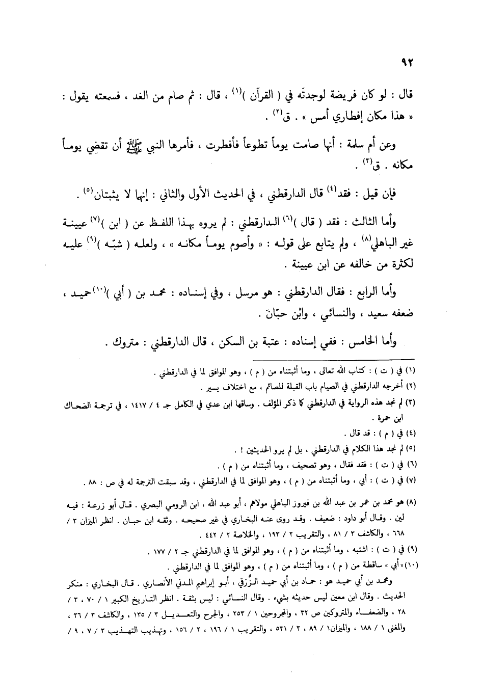 وَأما الرَّابِع فَقَالَ الدَّارَقُطْنِيّ هُوَ مُرْسل وَفِي إِسْنَاده مُحَمَّد بن أبي حميد ضعفه سعيد وَالنَّسَائِيّ وَابْن حبَان وَأما الْخَامِس فَفِي إِسْنَاده عتبَة بن السكن قَالَ الدَّارَقُطْنِيّ مَتْرُوك