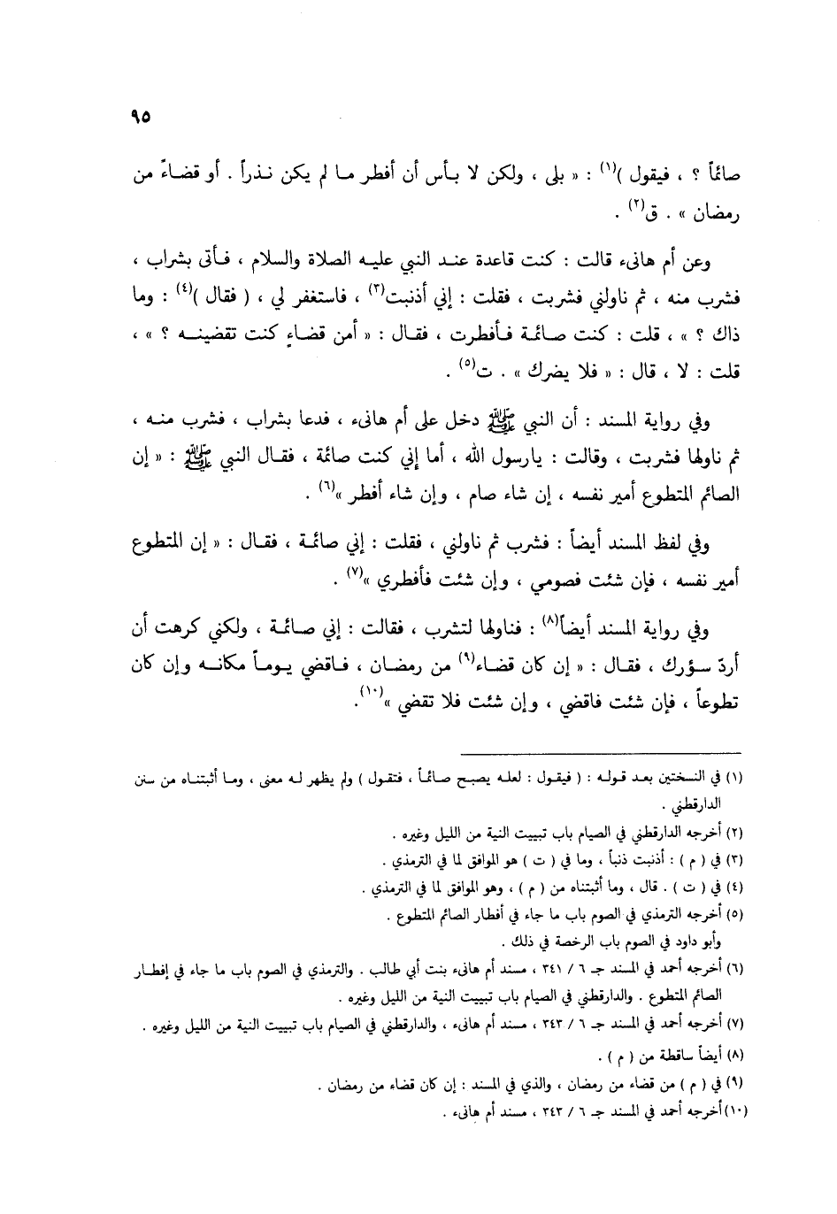 وَعَن أم هانىء قَالَت كنت قَاعِدَة عِنْد النَّبِي عَلَيْهِ الصَّلَاة وَالسَّلَام فَأتى بشراب فَشرب مِنْهُ ثمَّ ناولني فَشَرِبت فَقلت إِنِّي أذنبت فَاسْتَغْفر لي فَقَالَ وَمَا ذَاك قلت كنت صَائِمَة فأفطرت فَقَالَ أَمن قَضَاء كنت تقضينه قلت لَا قَالَ فَلَا يَضرك ت