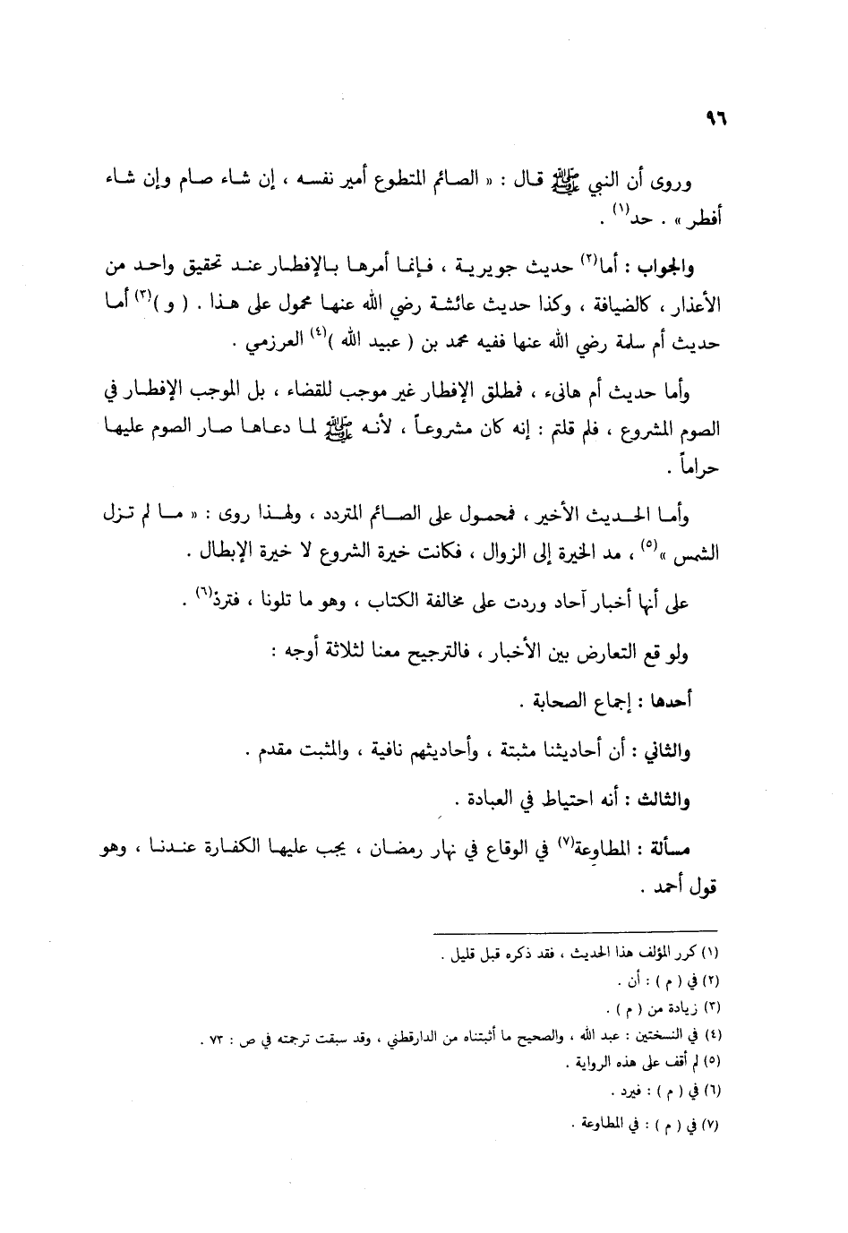 وَأما الحَدِيث الْأَخير فَمَحْمُول على الصَّائِم المتردد وَلِهَذَا روى مَا لم تزل الشَّمْس مد الْخيرَة إِلَى الزَّوَال فَكَانَت خيرة الشُّرُوع لَا خيرة الْإِبْطَال على أَنَّهَا أَخْبَار آحَاد وَردت على مُخَالفَة الْكتاب وَهُوَ مَا تلونا فَترد وَلَو وَقع التَّعَارُض بَين الْأَخْبَار فالترجيح مَعنا لثَلَاثَة أوجه أَحدهَا إِجْمَاع الصَّحَابَة وَالثَّانِي إِن أحاديثنا مثبتة وأحاديثهم نَافِيَة والمثبت مقدم وَالثَّالِث أَنه احْتِيَاط فِي الْعِبَادَة مَسْأَلَة المطاوعة فِي الوقاع فِي نَهَار رَمَضَان يجب عَلَيْهَا الْكَفَّارَة عندنَا وَهُوَ قَول أَحْمد
