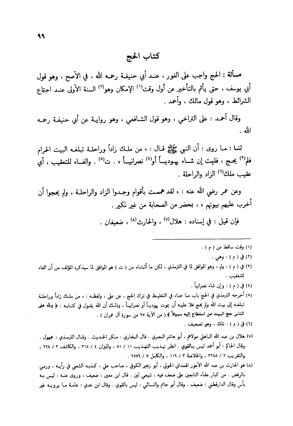 مَسْأَلَة الْحَج وَاجِب على الْفَوْر عِنْد أبي حنيفَة رَحمَه الله فِي الْأَصَح وَهُوَ قَول أبي يُوسُف حَتَّى يَأْثَم بِالتَّأْخِيرِ عَن أول وَقت الْإِمْكَان وَهُوَ السّنة الأولى عِنْد اجْتِمَاع الشَّرَائِط وَهُوَ قَول مَالك وَأحمد وَقَالَ أَحْمد على التَّرَاخِي وَهُوَ قَول الشَّافِعِي وَهُوَ رِوَايَة عَن أبي حنيفَة رَحمَه الله لنا مَا روى أَن النَّبِي صلى الله عَلَيْهِ وَسلم قَالَ من ملك زادا وراحلة تبلغه الْبَيْت الْحَرَام فَلم يحجّ فليمت إِن شَاءَ يَهُودِيّا أَو نَصْرَانِيّا ت وَالْفَاء للتعقيب أَي عقيب ملك الزَّاد وَالرَّاحِلَة