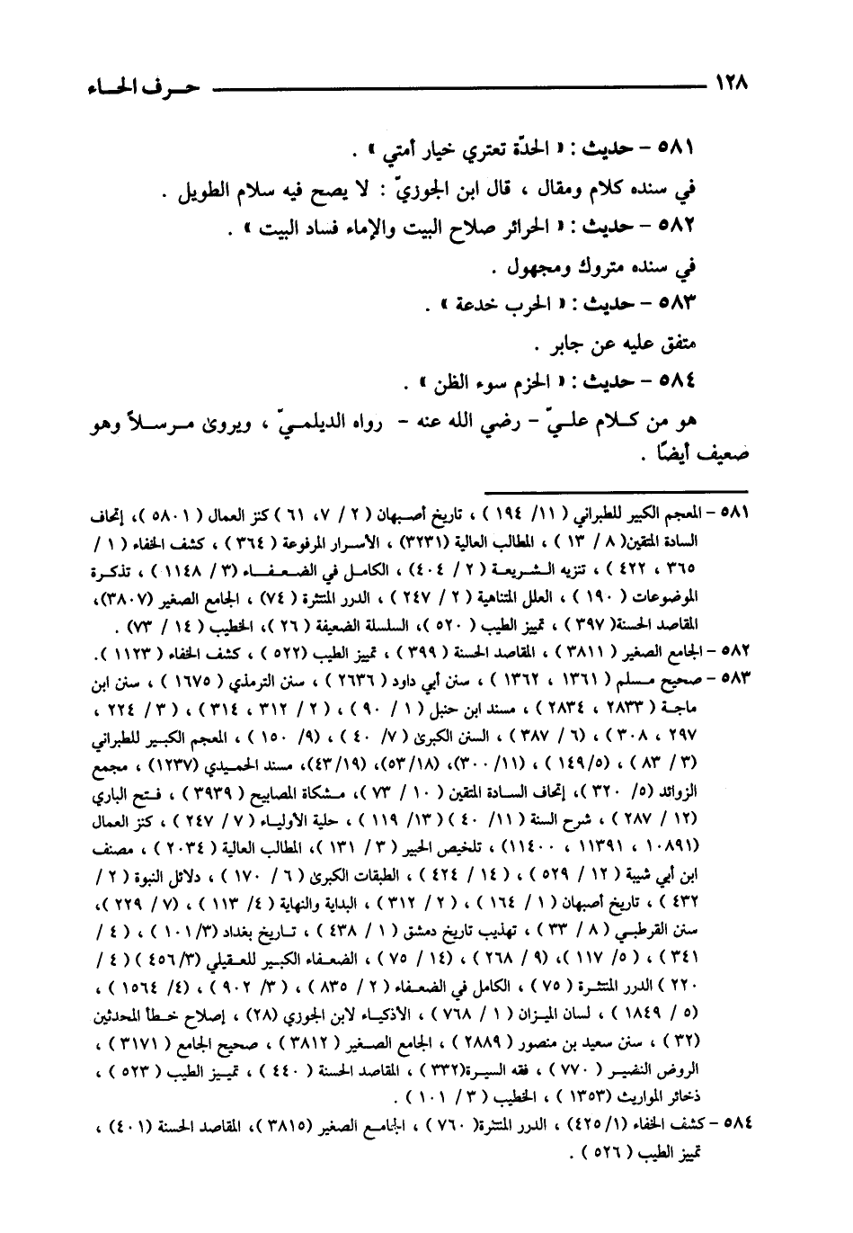 584 - حَدِيث: " الحزم سوء الظَّن ". هُوَ من كَلَام عَليّ - رض الله عَنهُ - رَوَاهُ الديلمي، ويروى مُرْسلا وَهُوَ ضَعِيف أَيْضا.