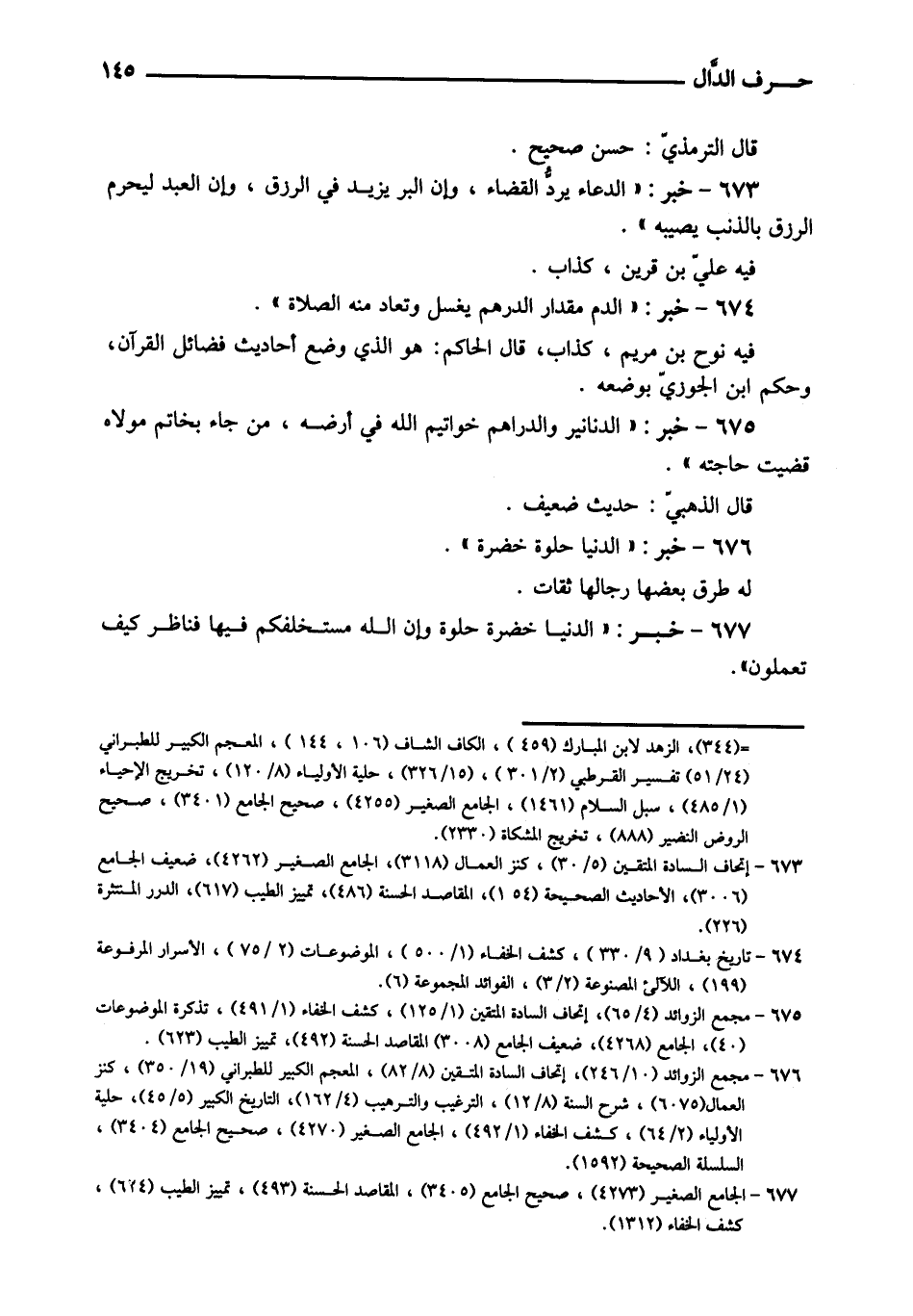 676 - خبر: " الدُّنْيَا حلوة خضرَة ". لَهُ طرق بَعْضهَا رجالها ثِقَات.