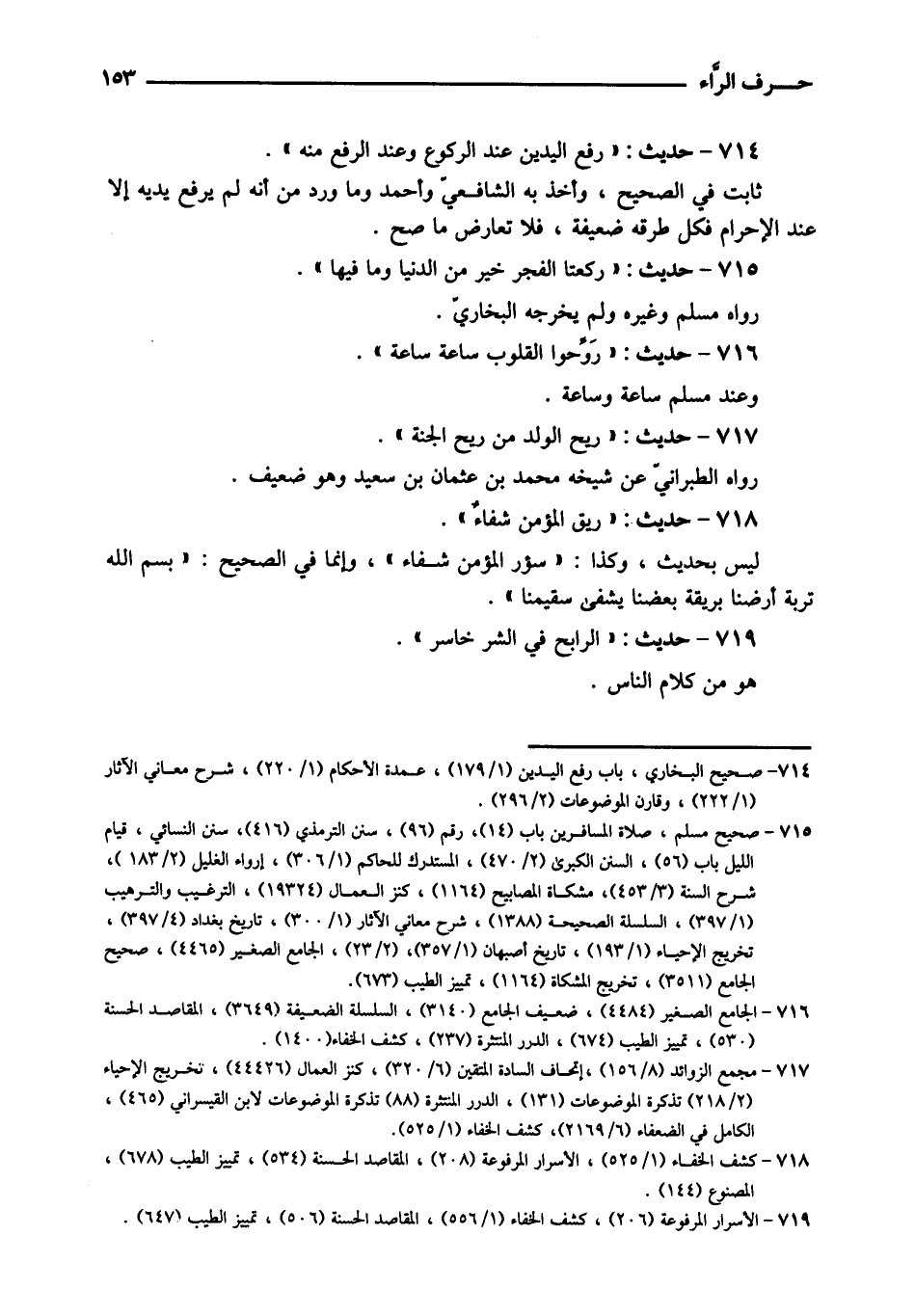 714 - حَدِيث: " رفع الْيَدَيْنِ عِنْد الرُّكُوع وَعند الرّفْع مِنْهُ ". ثَابت فِي الصَّحِيح، وَأخذ بِهِ الشَّافِعِي وَأحمد وَمَا ورد من أَنه لم يرفع يَدَيْهِ إِلَّا عِنْد الْإِحْرَام فَكل طرقه ضَعِيفَة، فَلَا تعَارض مَا صَحَّ.