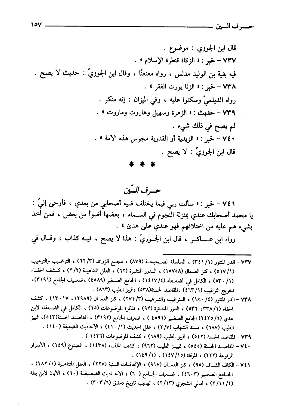 737 - خبر: " الزَّكَاة قنطرة الْإِسْلَام ". فِي بَقِيَّة بن الْوَلِيد مُدَلّس، رَوَاهُ مُعَنْعنًا، وَقَالَ ابْن الْجَوْزِيّ: حَدِيث لَا يَصح.