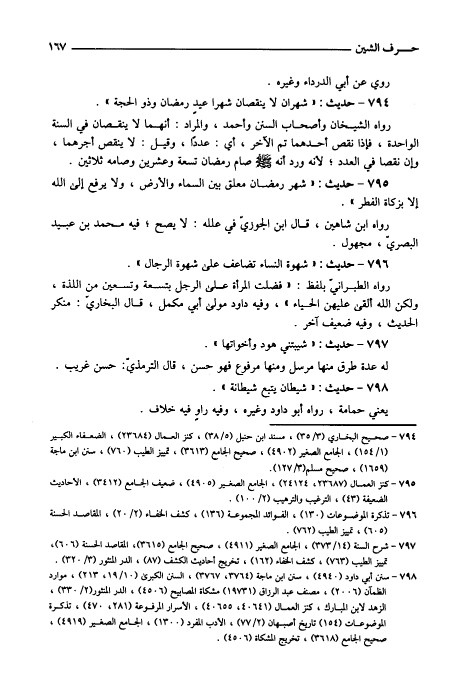 794 - حَدِيث: " شَهْرَان لَا ينقصان شهرا عيد رَمَضَان وَذُو الْحجَّة ". رَوَاهُ الشَّيْخَانِ وَأَصْحَاب السّنَن وَأحمد، وَالْمرَاد: أَنَّهُمَا لَا ينقصان فِي السّنة الْوَاحِدَة، فَإِذا نقص أَحدهمَا تمّ الآخر، أَي: عددا، وَقيل: لَا ينقص أجرهما، وَإِن نقصا فِي الْعدَد؛ لِأَنَّهُ ورد أَنه صلى الله عَلَيْهِ وَسلم صَامَ رَمَضَان تِسْعَة وَعشْرين وصامه ثَلَاثِينَ.
