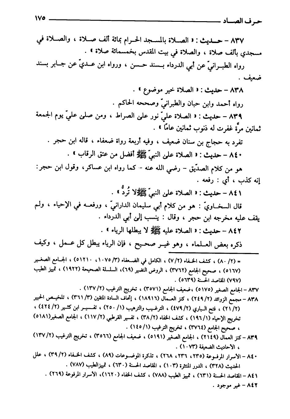 839 - حَدِيث: " الصَّلَاة عليّ نور على الصِّرَاط، وَمن صلى عليّ يَوْم الْجُمُعَة ثَمَانِينَ مرّة غفرت لَهُ ذنُوب ثَمَانِينَ عَاما ". تفرد بِهِ حجاج بن سِنَان ضَعِيف، وَفِيه أَرْبَعَة رَوَاهُ ضعفاء، قَالَه ابْن حجر.