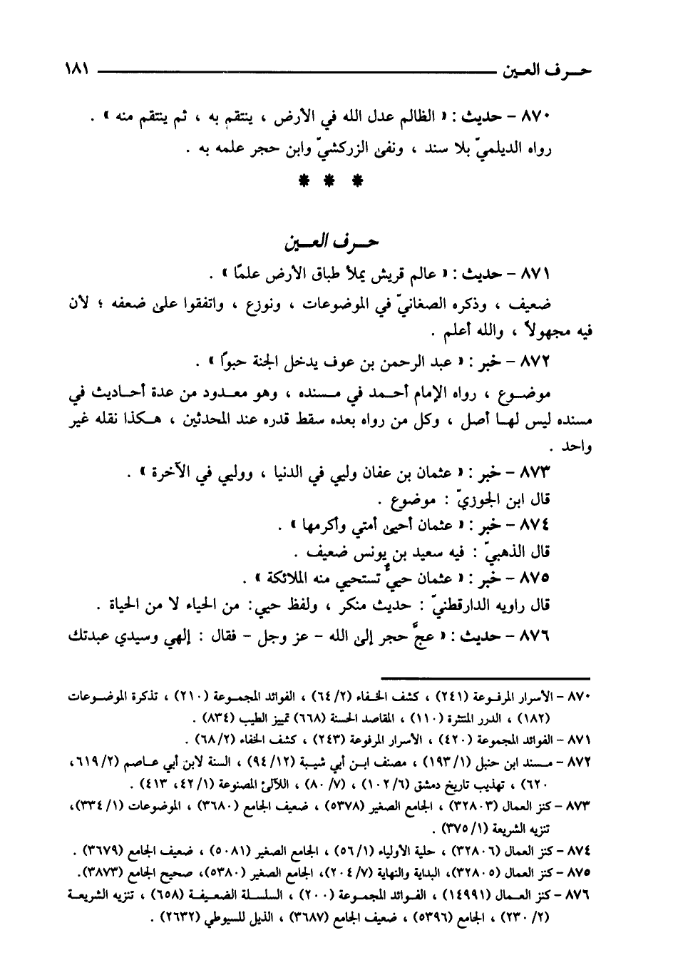 871 - حَدِيث: " عَالم قُرَيْش يمْلَأ طباق الأَرْض علما ". ضَعِيف، وَذكره الصغاني فِي الموضوعات، ونوزع، وَاتَّفَقُوا على ضعفه؛ لِأَن فِيهِ مَجْهُولا، وَالله أعلم.