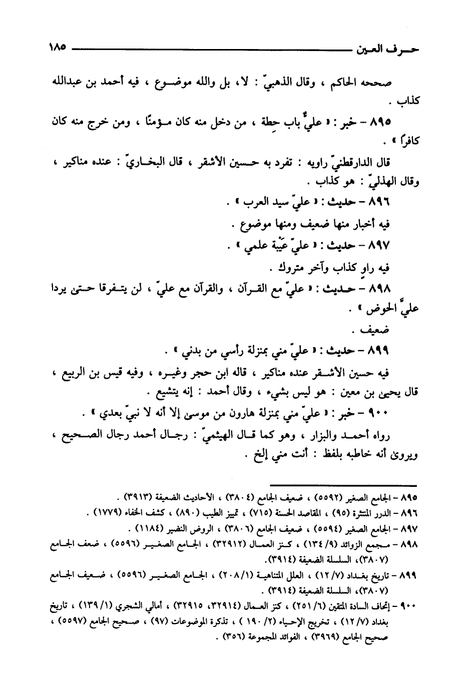 895 - خبر: " عليّ بَاب حطة، من دخل مِنْهُ كَانَ مُؤمنا، وَمن خرج مِنْهُ كَانَ كَافِرًا ". قَالَ الدَّارَقُطْنِيّ رَاوِيه: تفرد بِهِ حُسَيْن الْأَشْقَر، قَالَ البُخَارِيّ: عِنْده مَنَاكِير، وَقَالَ الْهُذلِيّ: هُوَ كَذَّاب.