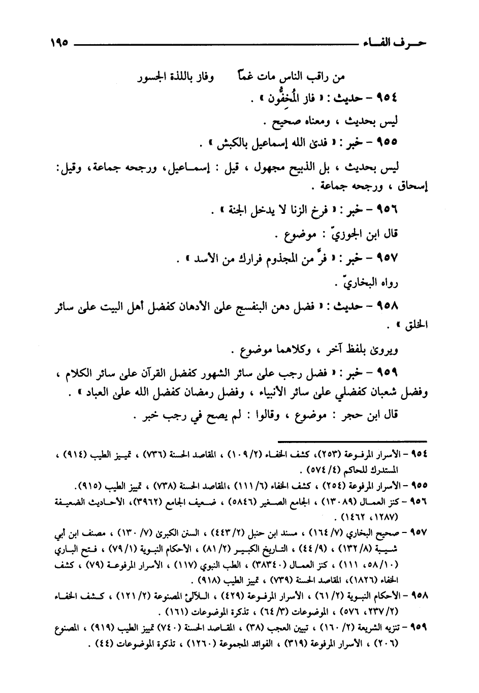 959 - خبر: " فضل رَجَب على سَائِر الشُّهُور كفضل الْقُرْآن على سَائِر الْكَلَام، وَفضل شعْبَان كفضلي على سَائِر الْأَنْبِيَاء، وَفضل كفضل الله على الْعباد ". قَالَ ابْن حجر: مَوْضُوع، وَقَالُوا: لم يَصح فِي رَجَب خبر.