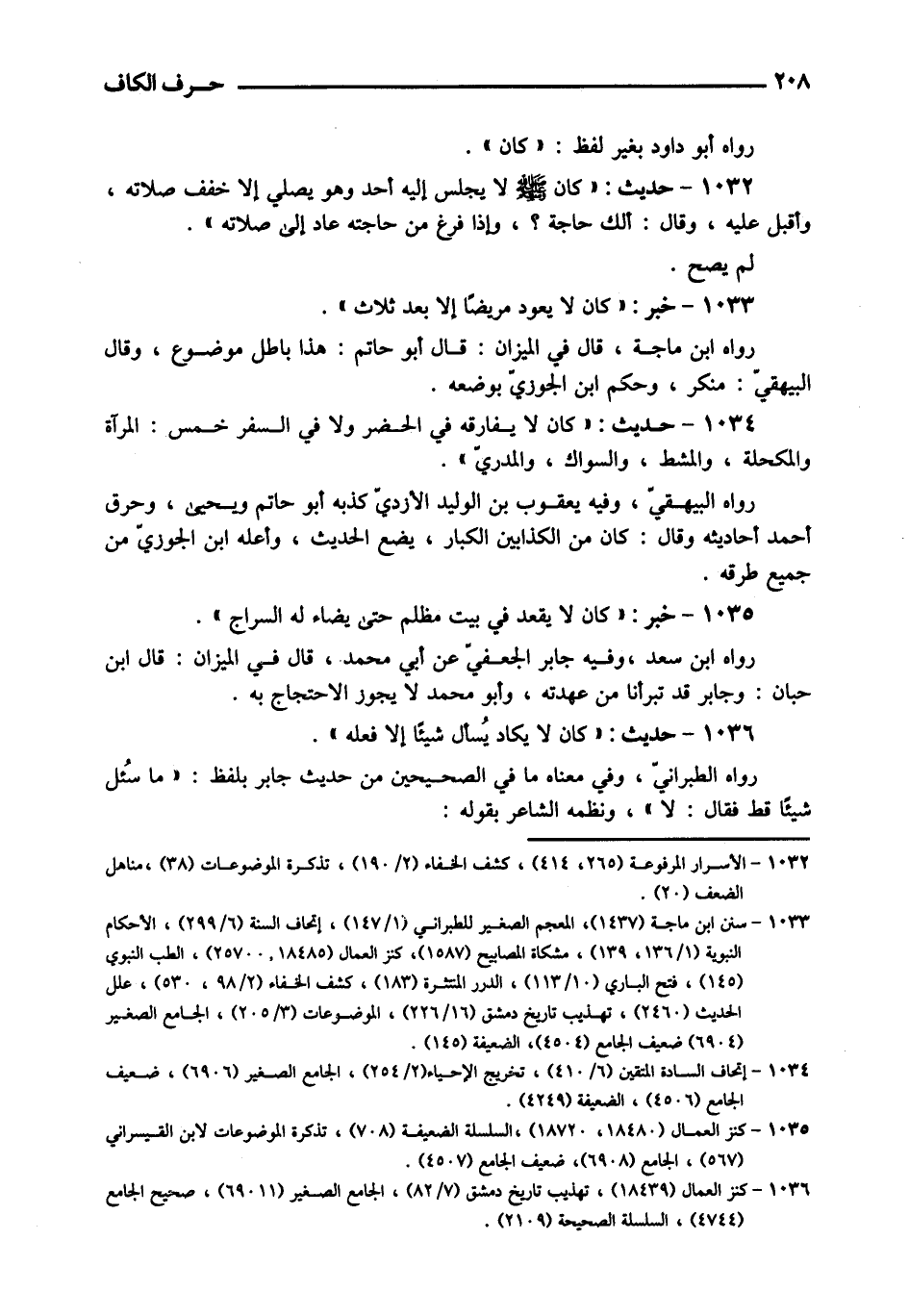 1033 - خبر: " كَانَ لَا يعود مَرِيضا إِلَّا بعد ثَلَاث ". روه ابْن ماجة، قَالَ فِي الْمِيزَان: قَالَ أَبُو حَاتِم: هَذَا بَاطِل مَوْضُوع، وَقَالَ الْبَيْهَقِيّ: مُنكر، وَحكم ابْن الْجَوْزِيّ بِوَضْعِهِ.