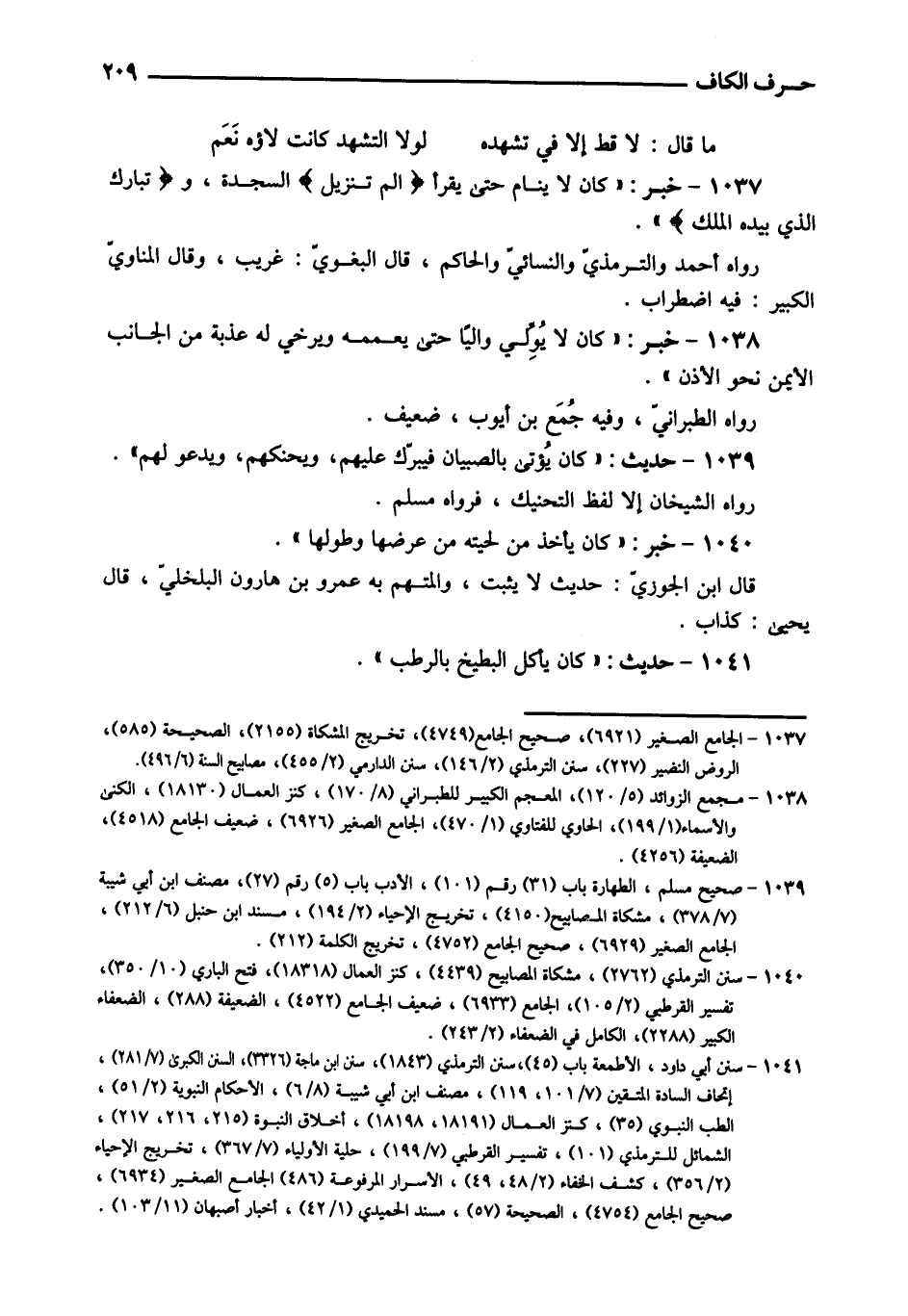 1037 - خبر: " كَانَ لَا ينَام حَتَّى يقْرَأ {الم تَنْزِيل} السَّجْدَة، حَدِيث: " {تبَارك الَّذِي بِيَدِهِ الْملك} ". رَوَاهُ أَحْمد وَالتِّرْمِذِيّ وَالنَّسَائِيّ وَالْحَاكِم، قَالَ الْبَغَوِيّ: غَرِيب، وَقَالَ الْمَنَاوِيّ الْكَبِير: فِيهِ اضْطِرَاب.