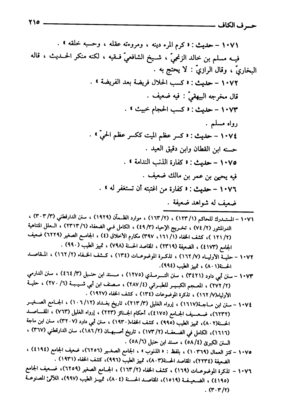 1071 - حَدِيث: " كرم الْمَرْء دينه، ومروءته عقله، وحسبه خلقه ". فِيهِ مُسلم بن خَالِد الزنْجِي، شيخ الشَّافِعِي فَقِيه، لكنه مُنكر الحَدِيث، قَالَه البُخَارِيّ، وَقَالَ الرَّازِيّ: لَا يحْتَج بِهِ.