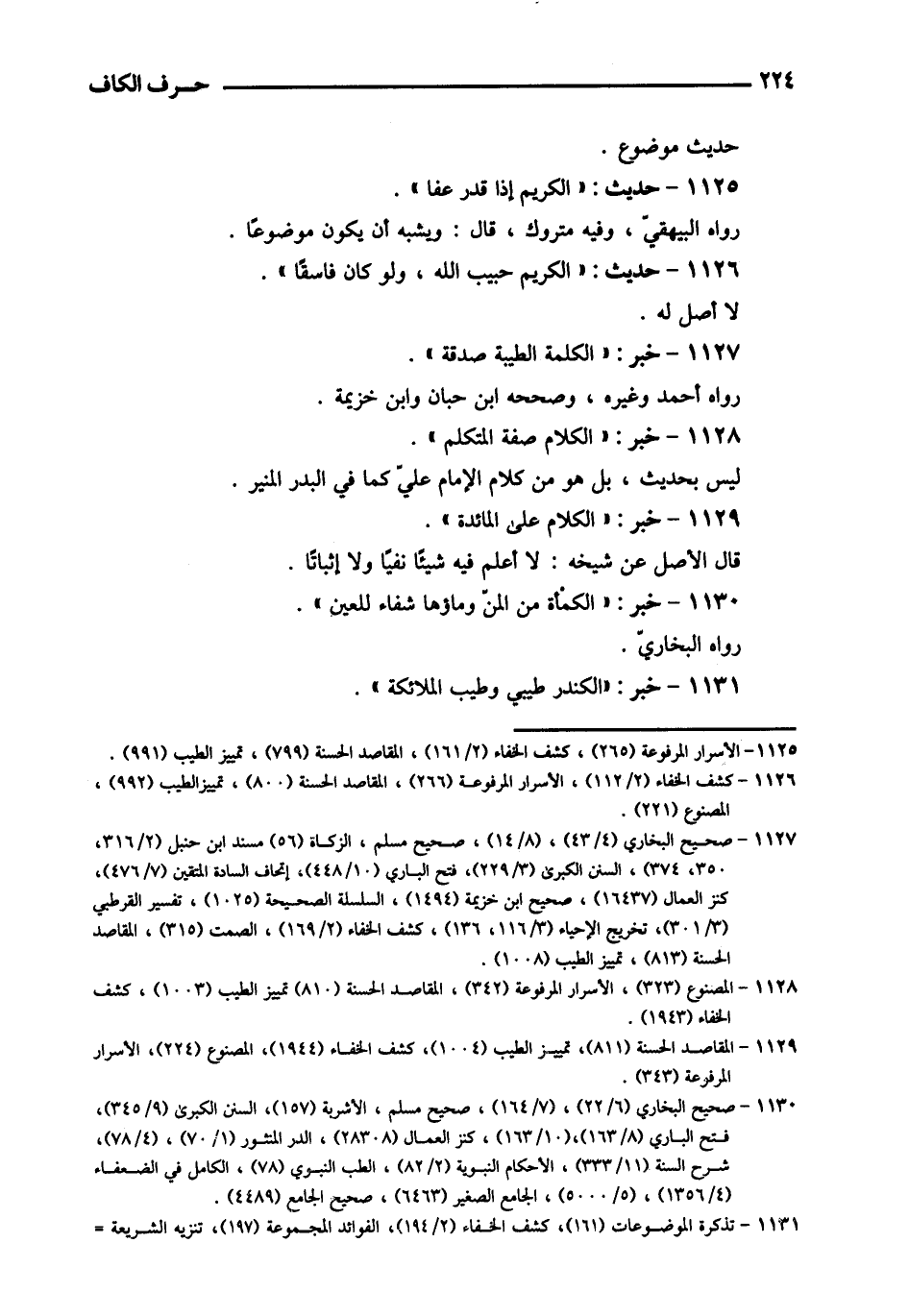 1125 - حَدِيث: " الْكَرِيم إِذا قدر عَفا ". رَوَاهُ الْبَيْهَقِيّ، وَفِيه مَتْرُوك، قَالَ: وَيُشبه أَن يكون مَوْضُوعا.
