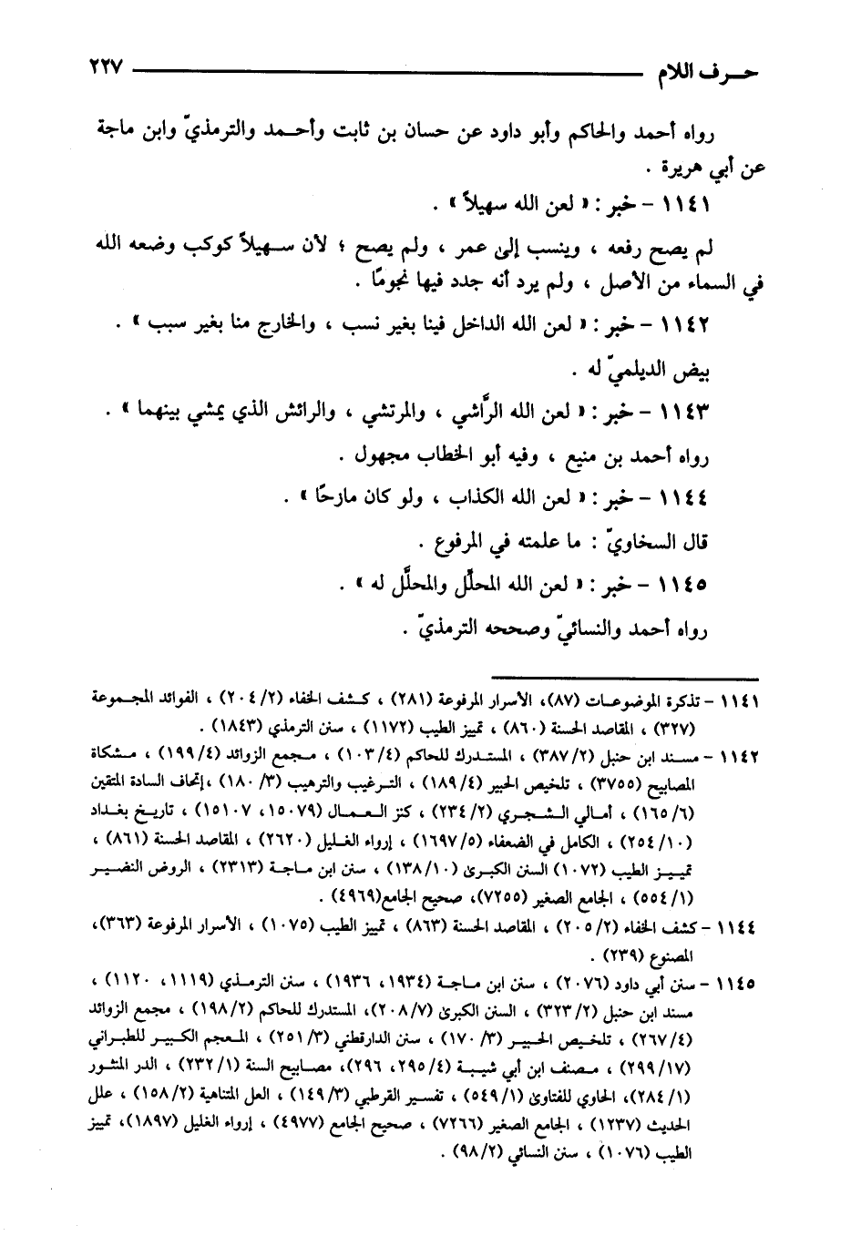 1141 - خبر: " لعن الله سهيلاً ". لم يَصح رَفعه، وينسب إِلَى عمر، وَلم يَصح؛ لِأَن سهيلا كَوْكَب وَضعه الله فِي السَّمَاء من الأَصْل، وَلم يرد أَنه جدد فِيهَا نجوما.