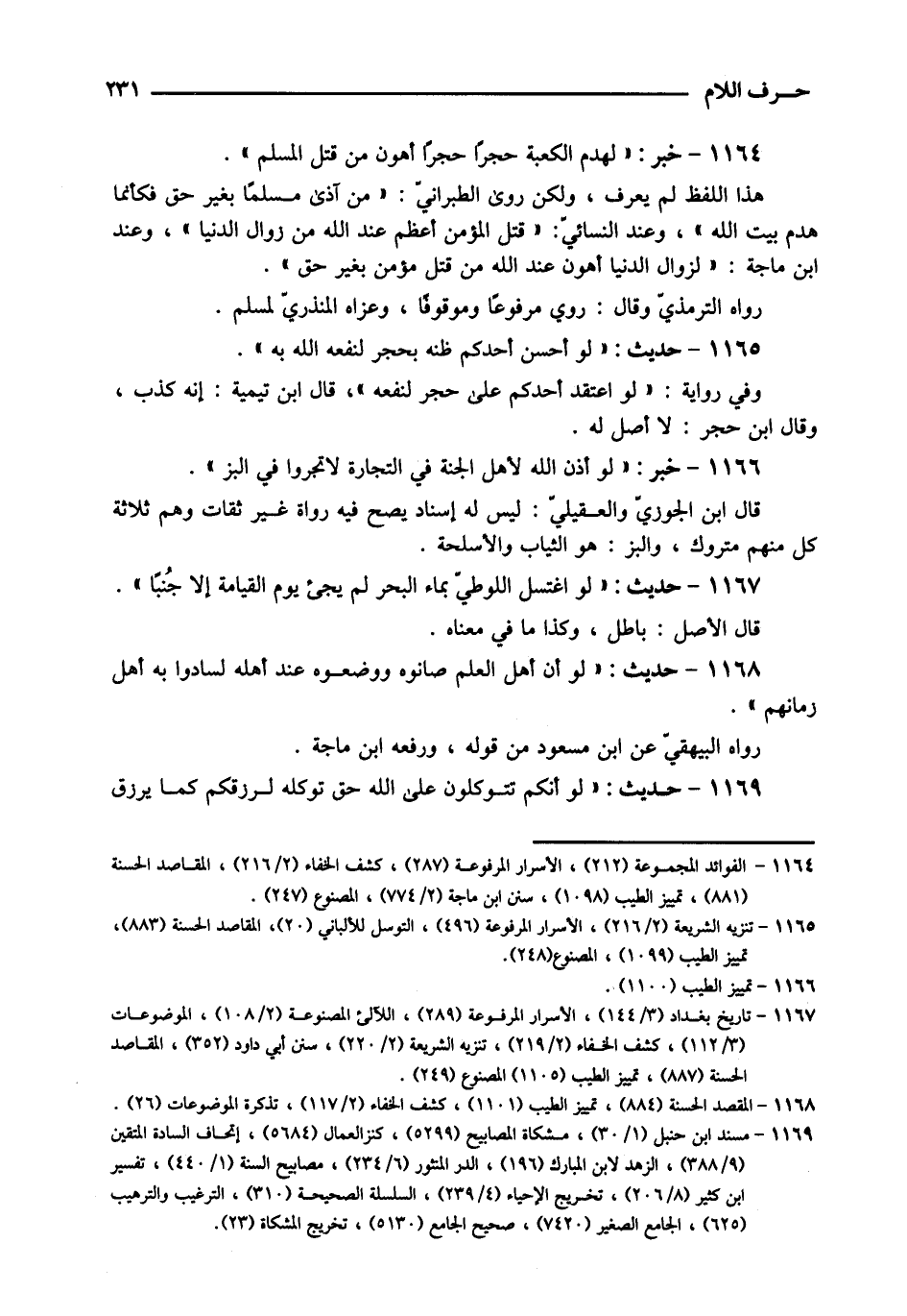 1165 - حَدِيث: " لَو أحسن أحدكُم ظَنّه بِحجر لنفعه الله بِهِ ". وَفِي رِوَايَة: " لَو اعْتقد أحدكُم على حجر لنفعه "، قَالَ ابْن تَيْمِية: إِنَّه كذب، وَقَالَ ابْن حجر: لَا أصل لَهُ.
