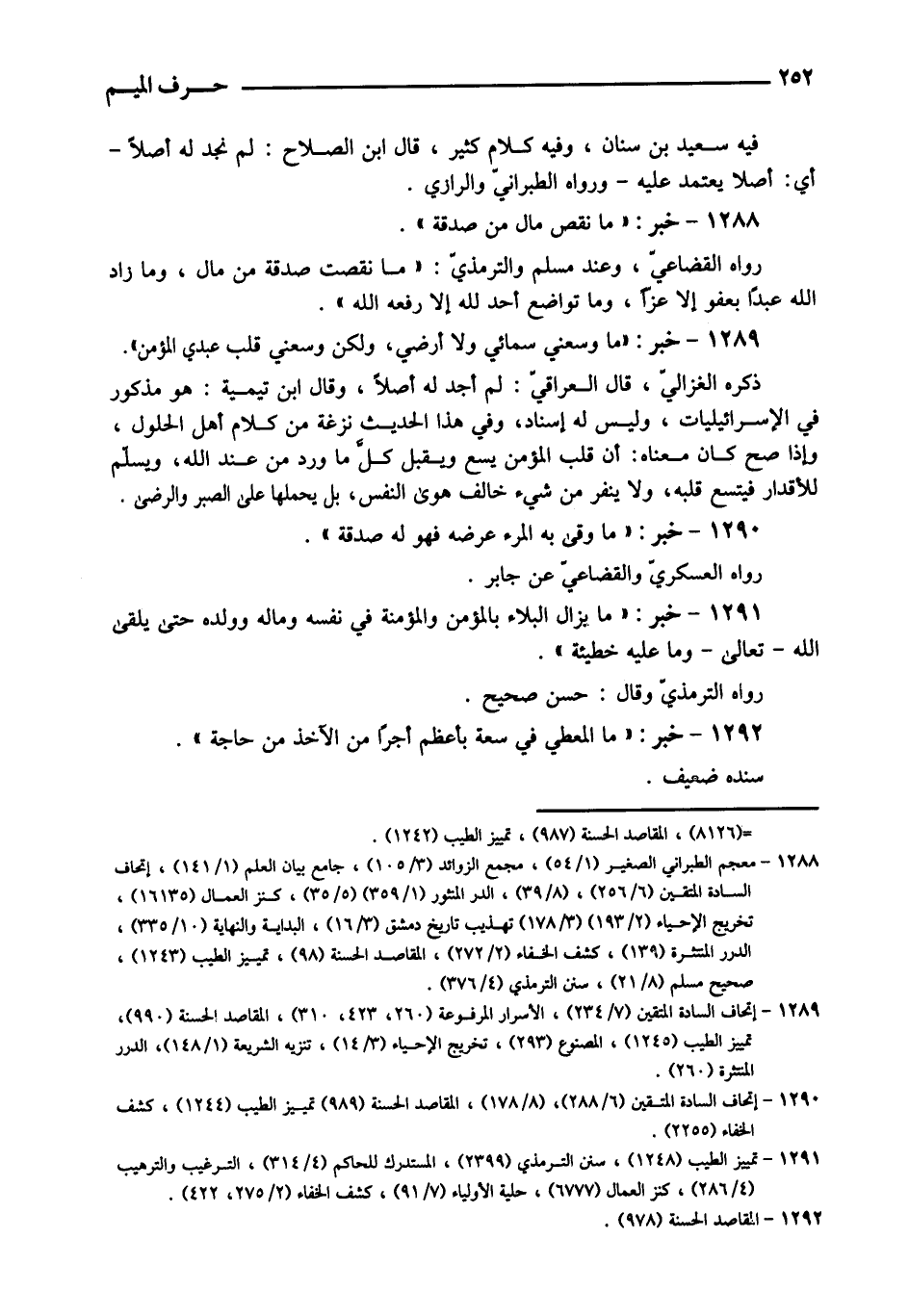 1292 - خبر: " مَا الْمُعْطِي فِي سَعَة بأعظم أجرا من الْآخِذ من حَاجَة ". سَنَده ضَعِيف.
