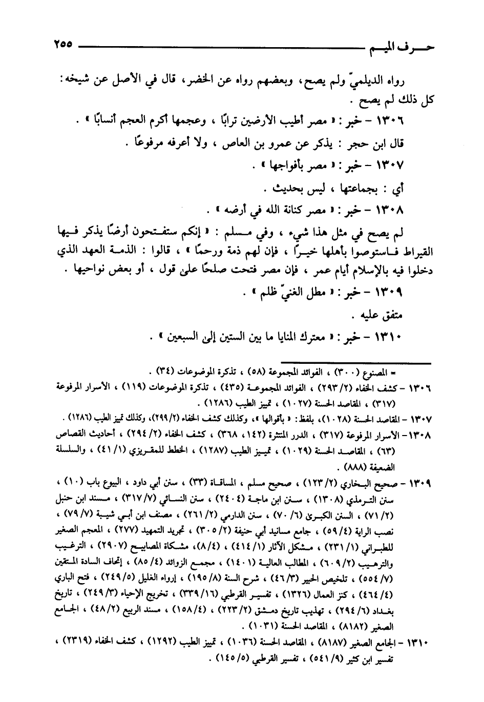 1306 - خبر: " مصر أطيب الْأَرْضين تُرَابا، وعجمها أكْرم الْعَجم أنسابا ". قَالَ ابْن حجر: يذكر عَن عَمْرو بن الْعَاصِ، وَلَا أعرفهُ مَرْفُوعا.